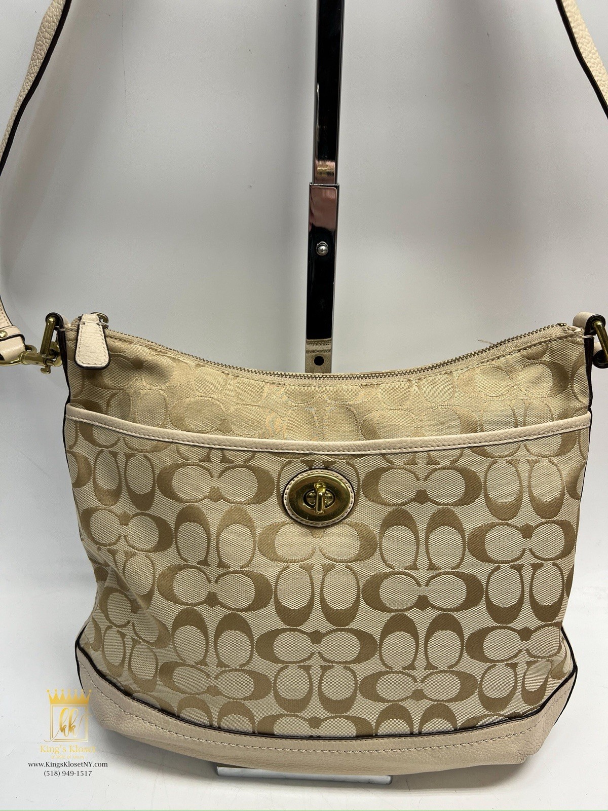 Coach signature turn lock crossbody bag 12x2x11 3 interior pockets, 1 exterior All closures are functional. The item shows signs of wear from normal use- Worn leather, Marks throughout, scratched and tarnished hardware, Staining on interior, Discoloration, Etc. Please refer to photos for further details. In store and our website for $80