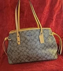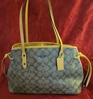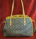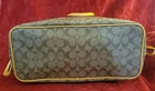 Coach Signature Handbag Tote Great Pre-owned Condition!!! Dimensions: 15"x6"x 8.5" Color: Yellow Mustard This Coach Handbag Tote features a Coach hangtag, leather drawstring ties on both sides if the bag. Inside there is an inside center zip. There are pockets on the inside and another zip pocket. Polyester lining. Enjoy this Coach Handbag Tote!!