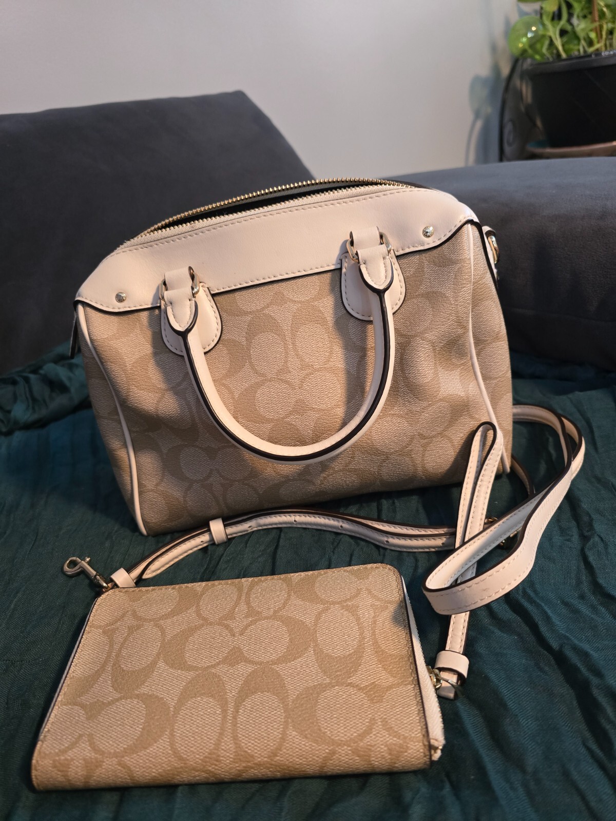 The Coach Small Bennett satchel in khaki and beige features a logo pattern with a detachable strap. It is designed for women and has a beige handle/strap color. The exterior is khaki with a matching beige lining. This set includes a matching wallet. The style is a satchel/top handle bag, making it a stylish and coordinated accessory set.