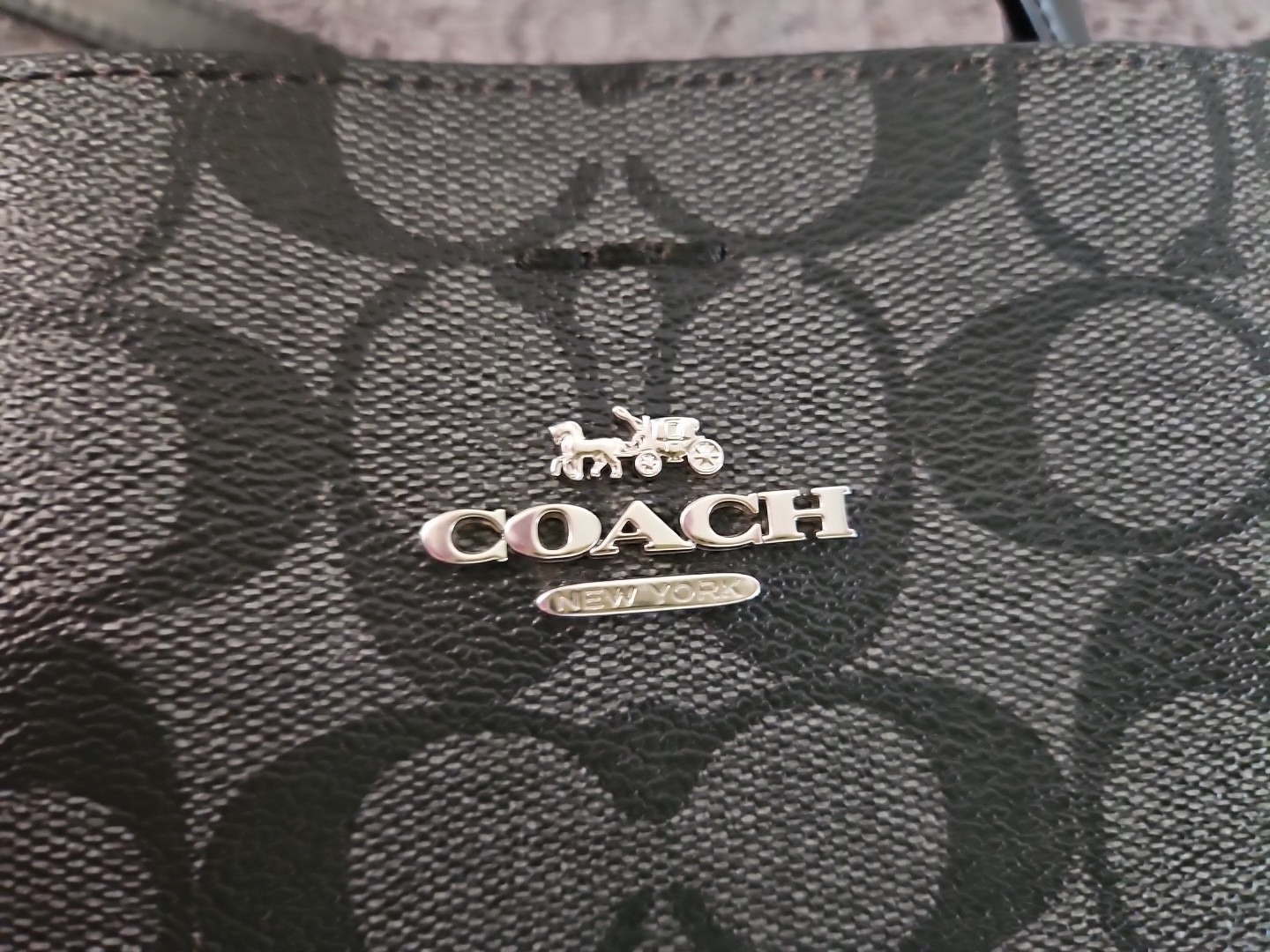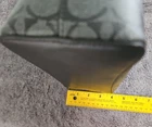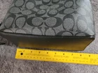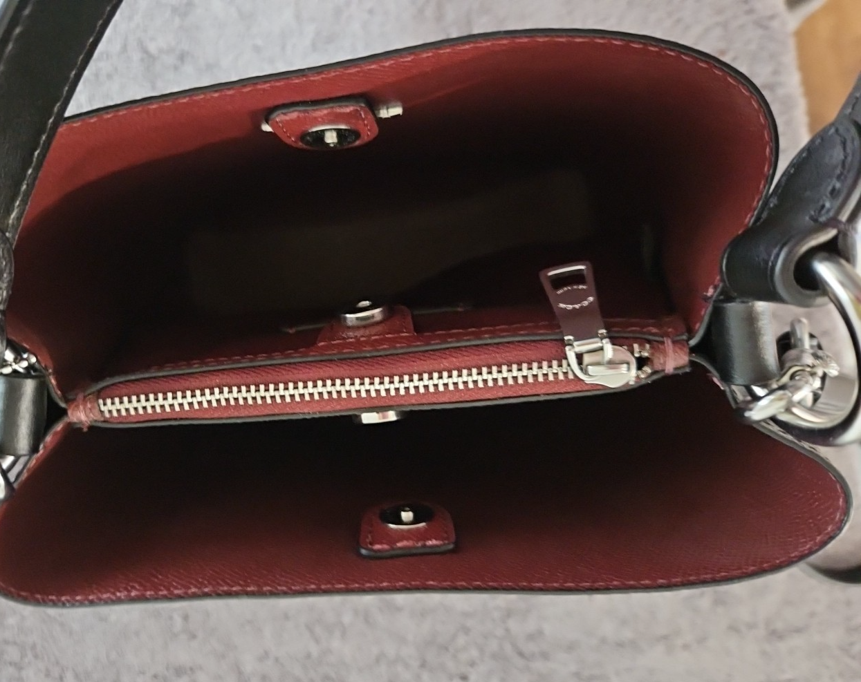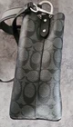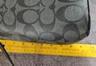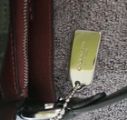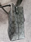 The Coach Signature Logo Small Town Bucket Bag in Black is a stylish and versatile accessory for women. This rectangular bag features a zip and magnetic closure, with a brown handle/strap and silver hardware accents. It is small in size, making it perfect for travel, parties, casual outings, and workwear. The bag is lightweight, water-resistant, and has inner dividers and pockets for organization. The exterior is made of vinyl, with a canvas and leather lining in red. The iconic Coach logo adds a touch of designer elegance to this fashionable crossbody bag. Liner is maroon cloth.