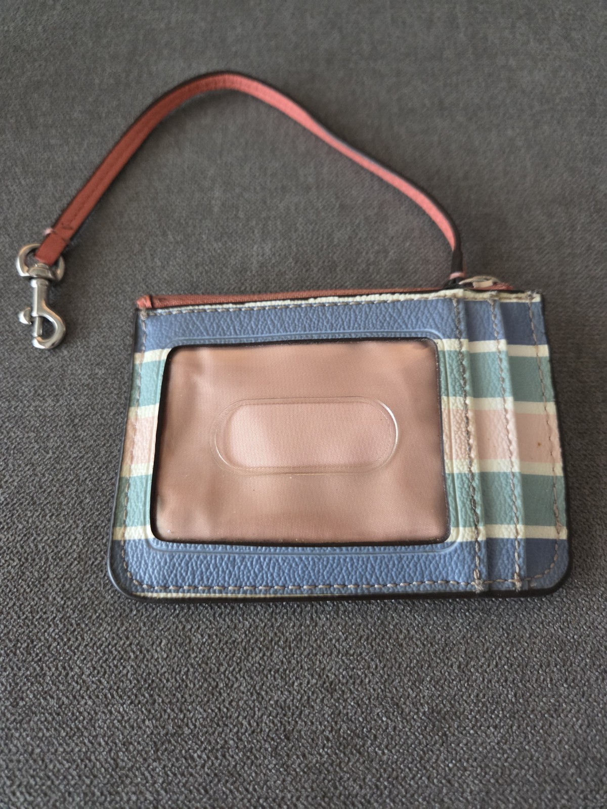 This Coach Small Wristlet Wallet Card Holder in pink, orange, and blue multicolor stripes is a stylish accessory for women. Made of leather with a zip closure and various accents like a strap, zipper, and logo, this wallet is both functional and fashionable. Perfect for on-the-go convenience, this wristlet wallet is a versatile addition to any outfit.