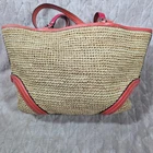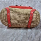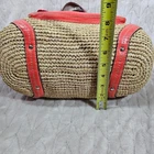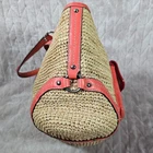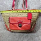 Beautiful coach bag with a woven wicket straw style body, with peach patent leather accents. Has a front pocket with a turn lock closure. Has the bag charm and double shoulder straps. Fully lined with a fabric, and has an interior zip pocket. In excellent pre owned condition, see photos for full details.