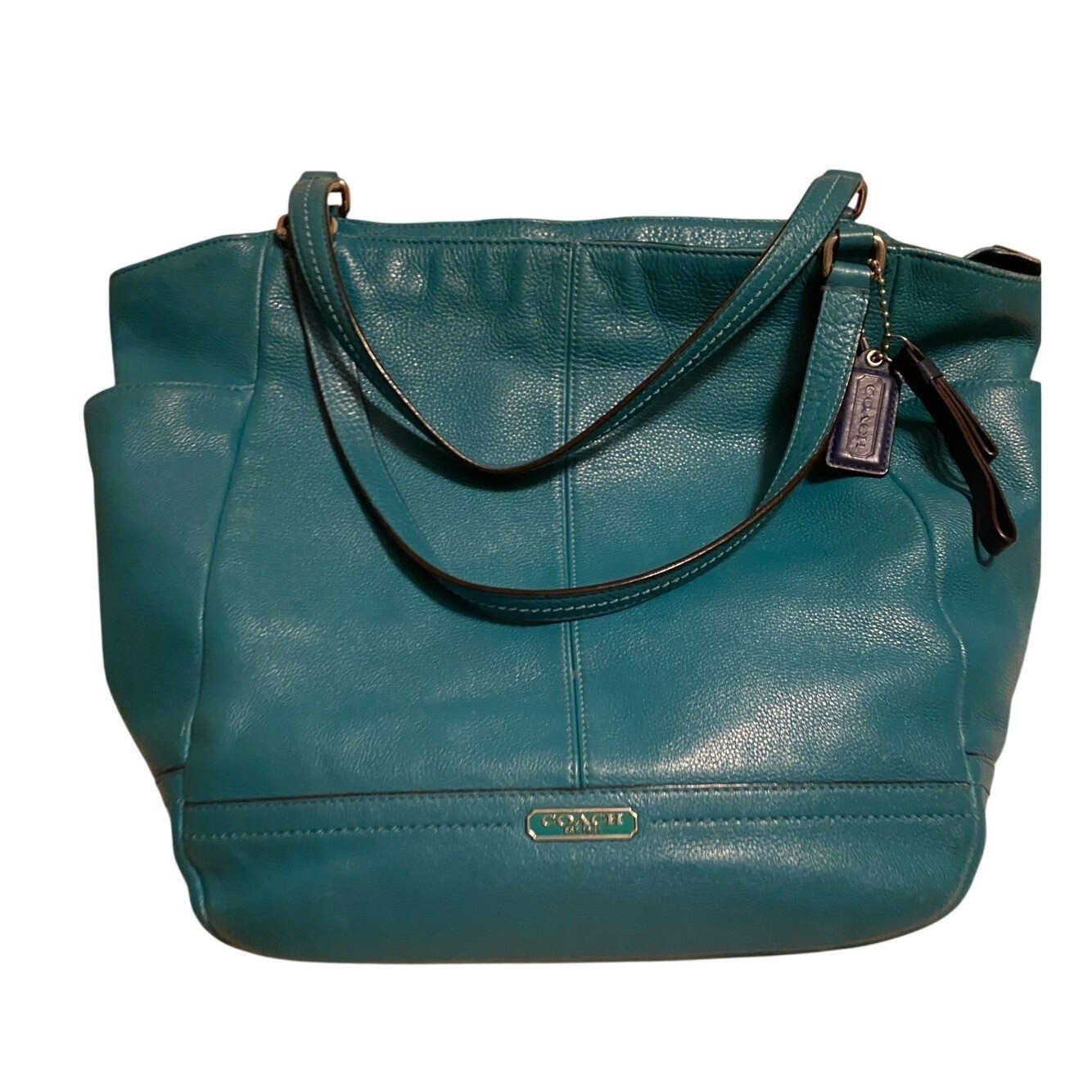 This Coach tote is absolutely stunning! The teal pebbled leather is rich and luxurious, while the gold hardware adds a touch of elegance. The size is perfect—roomy enough for daily essentials but still sleek. Love the detachable strap for hands-free wear, and the interior pockets keep everything organized. The craftsmanship is top-notch, as expected from Coach. A must-have for anyone who loves stylish, functional bags!