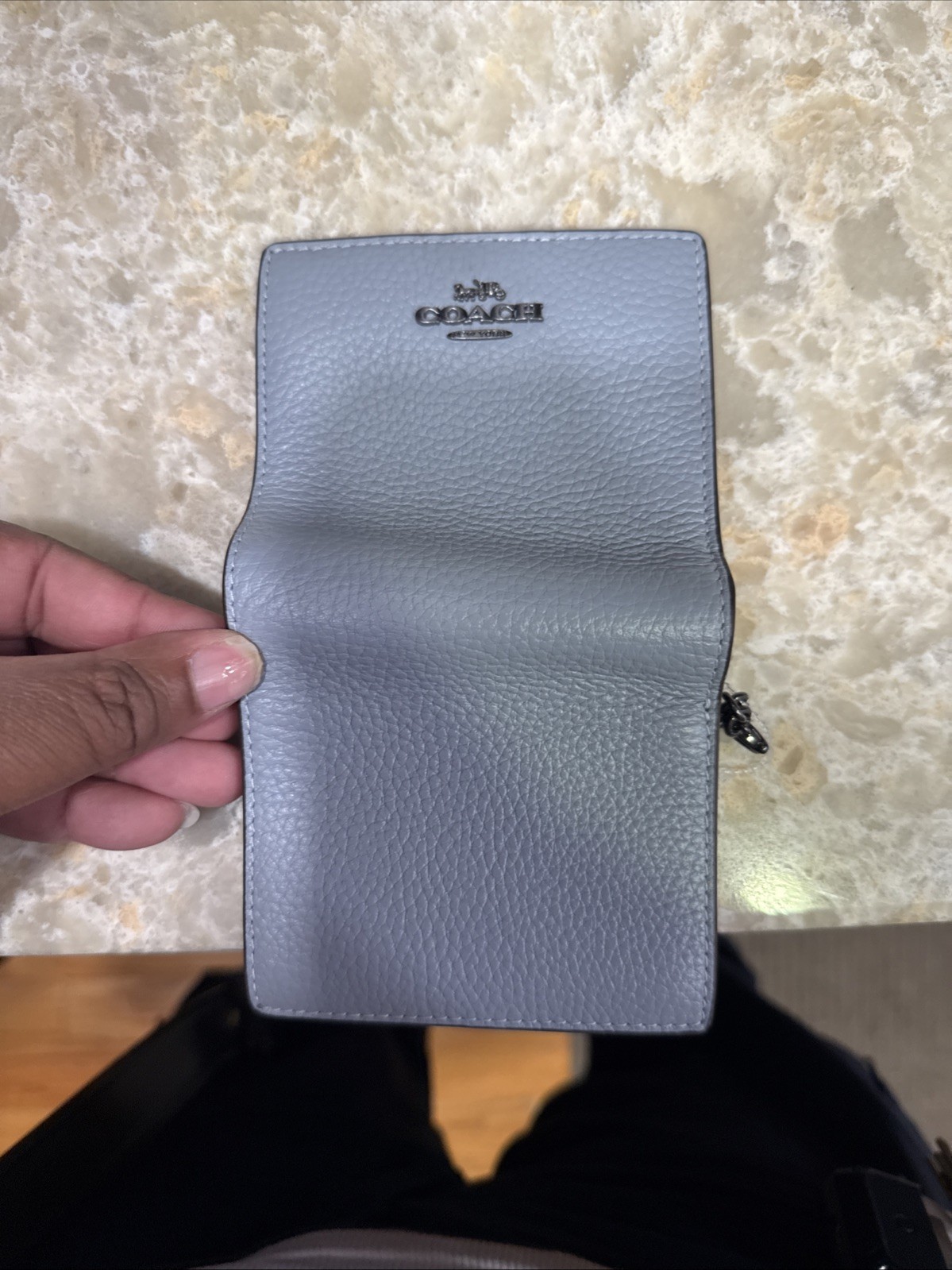 The Coach Wallet is a stylish and practical accessory for women, featuring a solid gray color with a leather material and canvas fabric type. This zip-around wallet is designed with credit card accents and the signature Coach logo, adding a touch of luxury to any outfit. With a small size and sleek design, this Coach wallet is the perfect blend of fashion and functionality for any woman on the go.