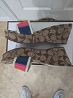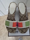 The Coach Wedge Heels in size 6.5 are a stylish and vintage option for women. The multicolor design with an open toe and slip-on closure makes these shoes a versatile choice for various outfits. With a mid-height wedge heel and signature Coach logo, these mule-style heels are perfect for adding a pop of color and sophistication to any ensemble. Excellent Condition see photos