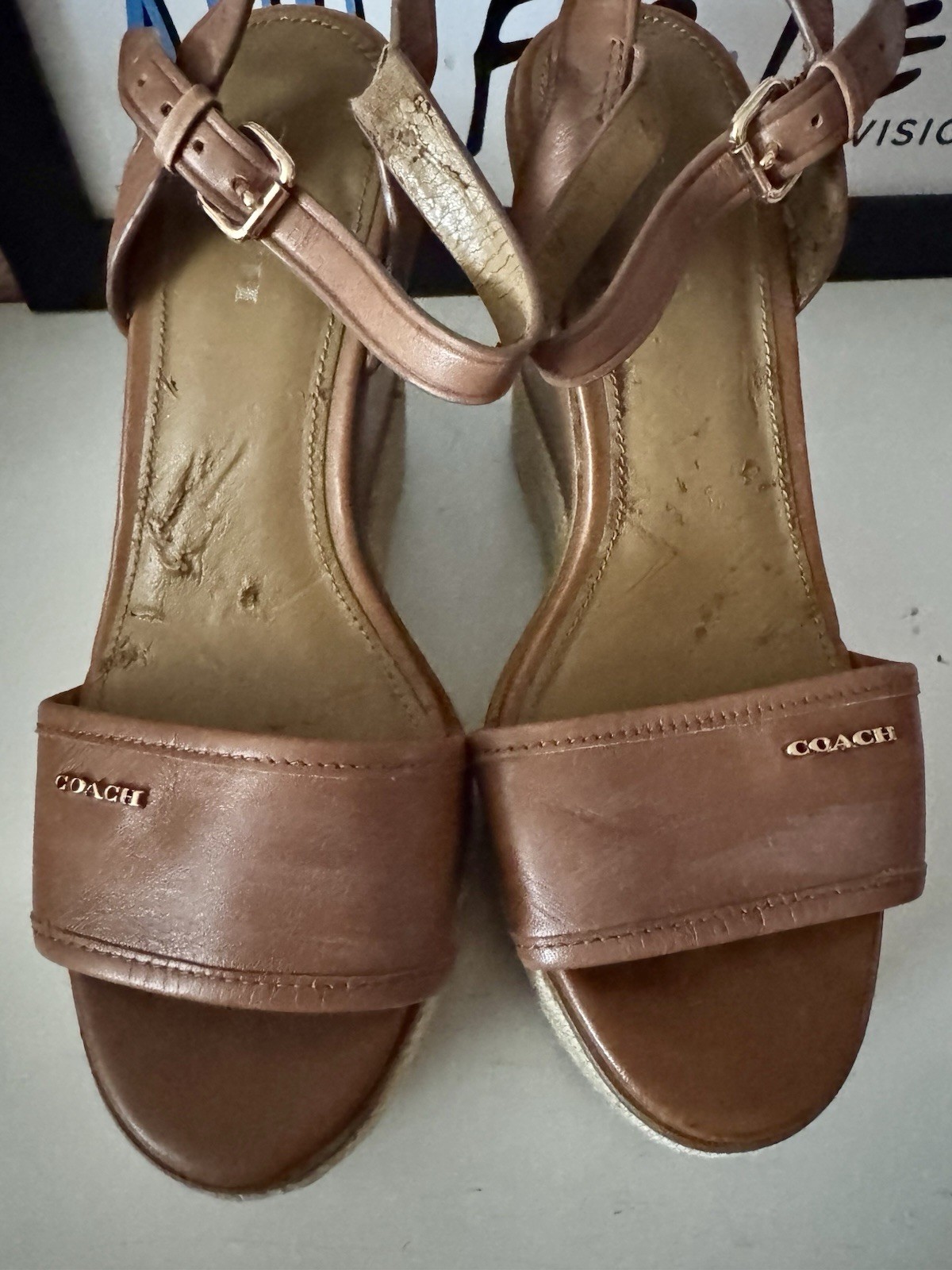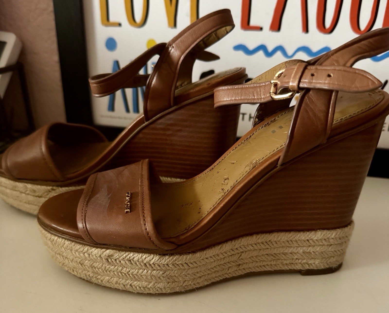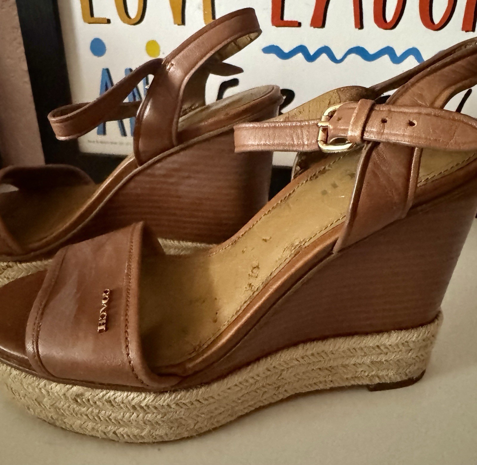 These Coach Wedge Sandals in Size 5 are a stylish addition to any woman's wardrobe. The brown leather sandals feature a solid pattern with a brand logo accent, making them perfect for casual occasions during the summer and spring seasons. The strappy design and wedge heel style offer both comfort and a touch of elegance, making them a versatile choice for everyday wear. Made in China as part of the Coach Signature product line, these sandals are a trendy and quality option for any fashion-conscious woman.