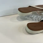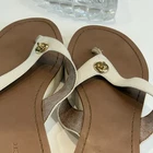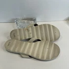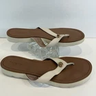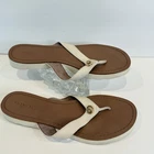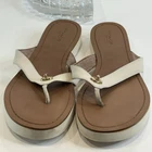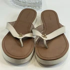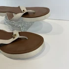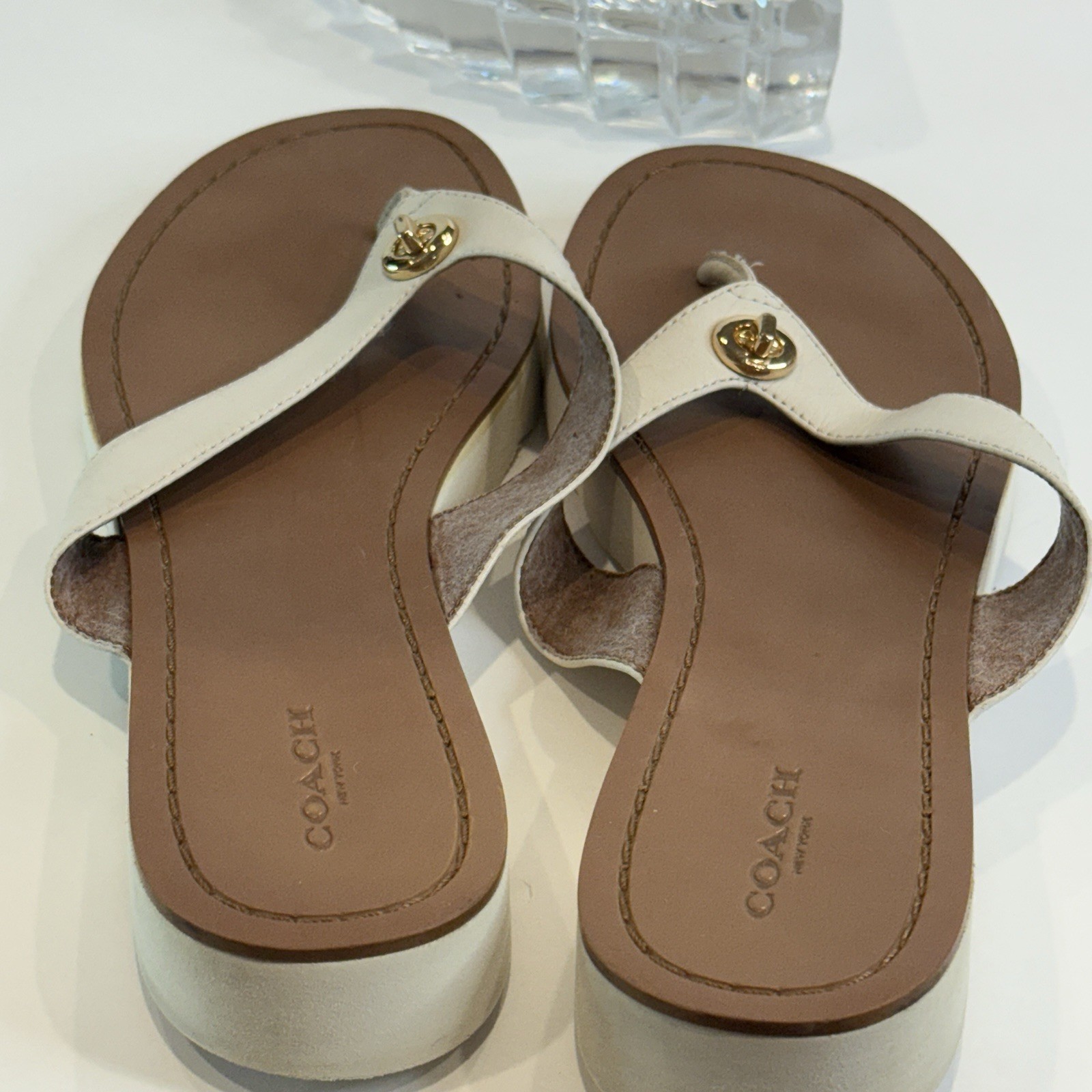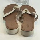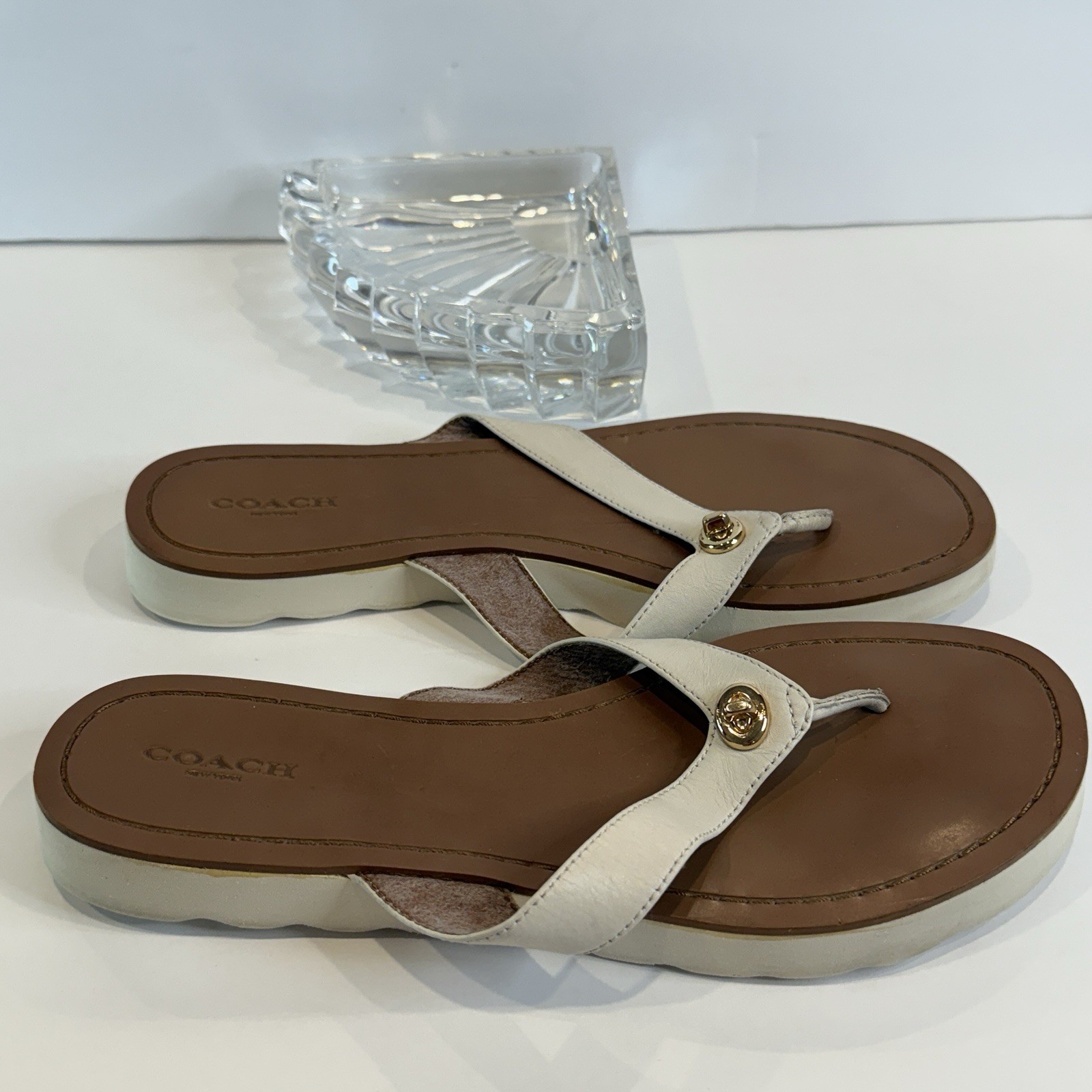 Authentic Coach New York women’s sandals • Size 9.5 US in elegant ivory leather with brown footbed • Classic flip flop / thong style with gold-tone Coach emblem accent • Durable rubber outsoles with Coach horse & carriage logo stamp • Comfortable leather upper with stitched detailing • Preloved charm – light wear on soles and slight signs of use (see photos) • Cleaned and sanitized inside and outside for your confidence • Perfect versatile sandal for summer, beach days, or casual