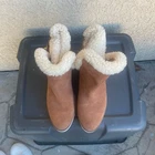The Coach Women's Kingston Brown Suede Shearling Winter Boots in Saddle Size 10 are stylish and comfortable winter footwear perfect for casual occasions. Made with a combination of suede and shearling fabric, these boots feature a cozy-lined interior and a durable rubber outsole. The classic saddle color and medium width make these boots versatile for various outfits and shoe sizes. Designed by Coach, these winter boots offer a fashionable and practical option for the colder seasons. No shoe box