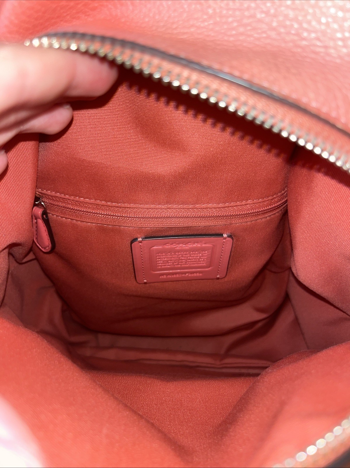 The Coach Women's Leather Backpack in pink features a classic solid design with a pebbled finish. It has two main pockets and a zip closure, with black leather handles/straps and pink hardware accents. The interior is lined with pink leather and includes a bag charm. This designer backpack from Coach is perfect for women who appreciate both style and functionality, with adjustable straps for added comfort.