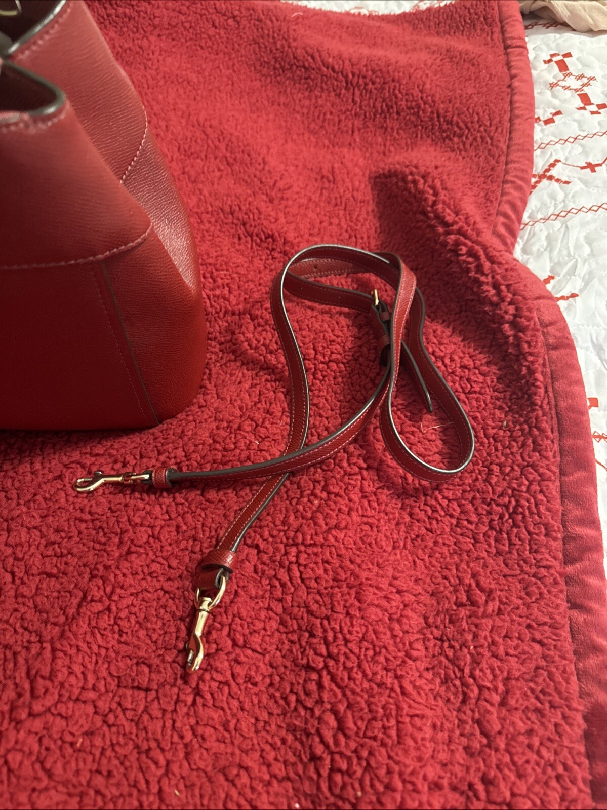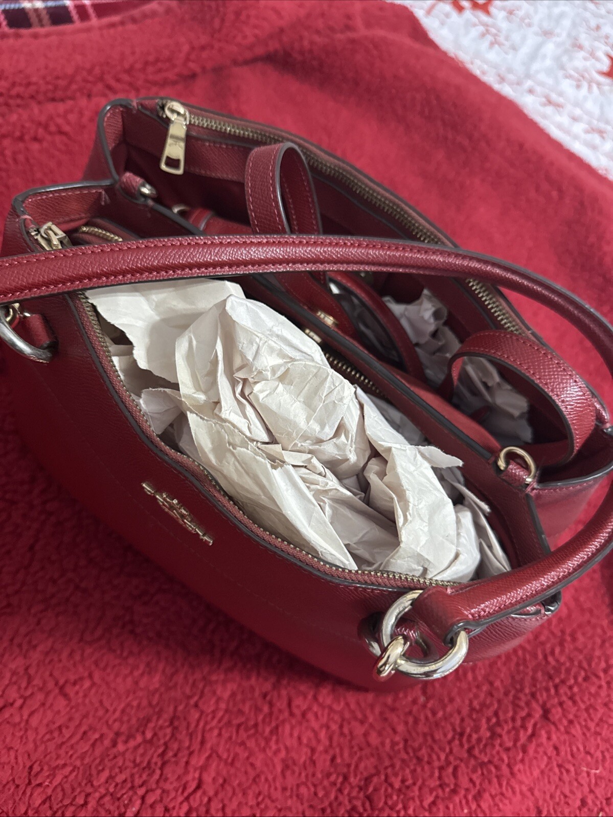 This is a large Coach crossbody bag in burgundy leather, accompanied by a matching wallet. The set is designed for women and offers a stylish and convenient way to carry essentials.