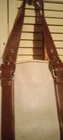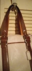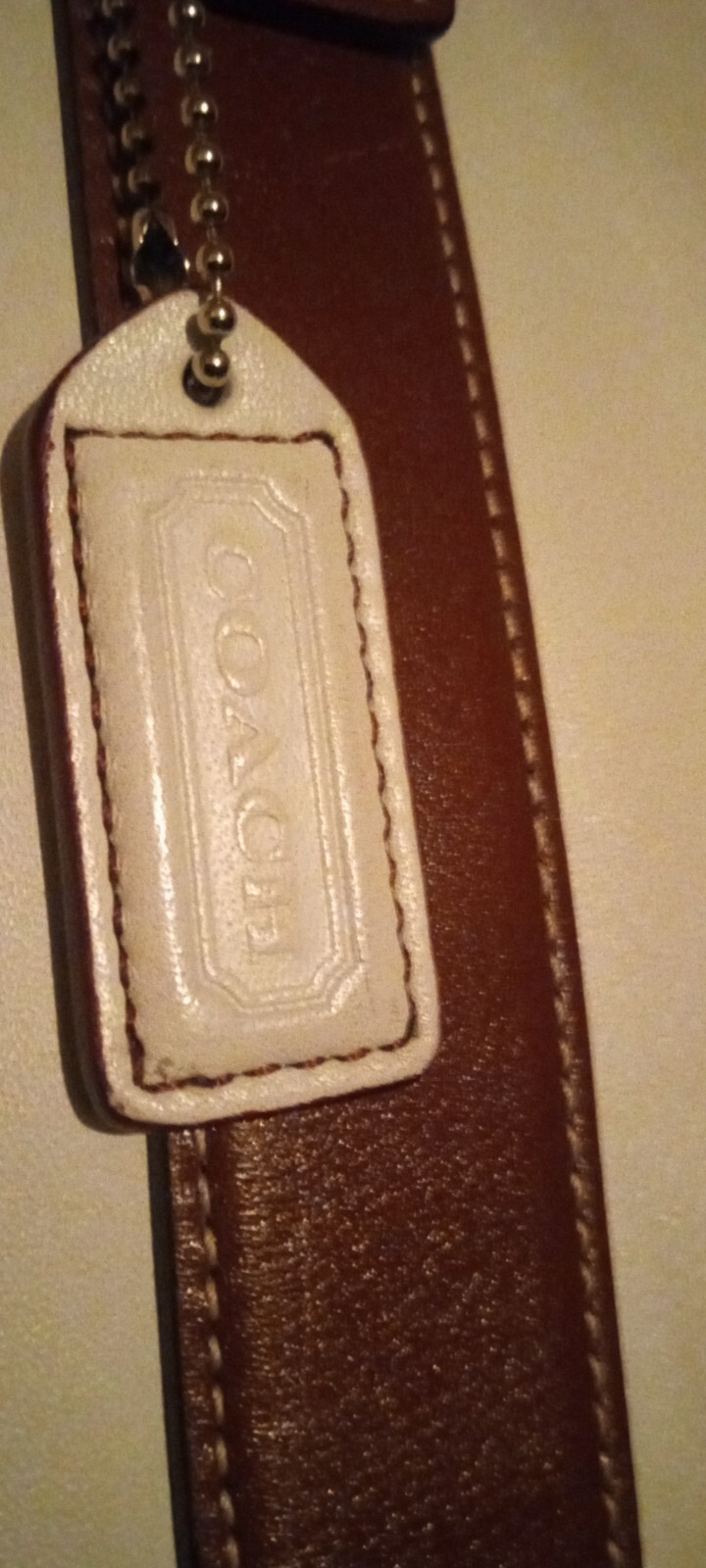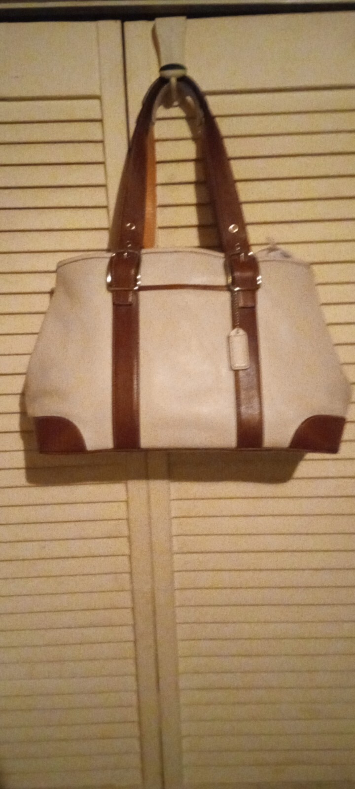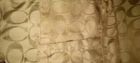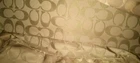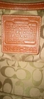 This is a beige purse with a gold emblem and leather-like material. It has two straps and is medium-sized. It looks like a classy and durable accessory. It is from the Coach Signature Collection, which features the iconic Coach logo on various fabrics and leather. The purse has a zip-top closure that keeps your belongings secure and a fabric lining that protects them from scratches. The purse has an interior zip pocket and two multifunction slip pockets for organizing your essentials.
