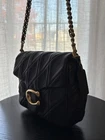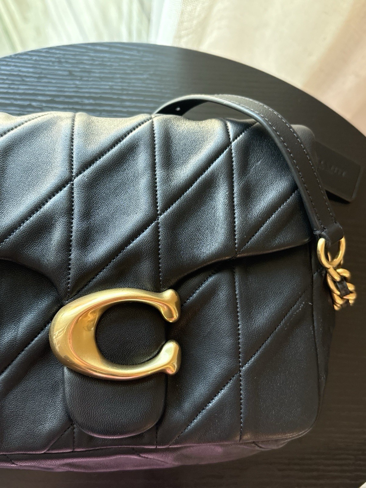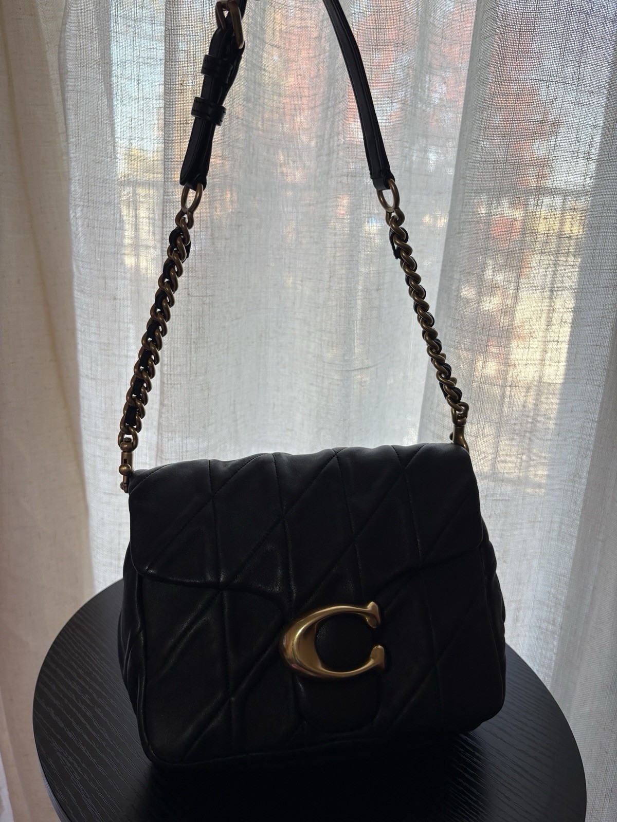 Authentic and New Coach quilted washed leather times square tabby shoulder bag. *** missing detachable long crossbody strap*** Any imperfections to be shown in the photos. Very tiny scratch on the gold C. This one is the medium sized bag. 7.75in x 6.4in x 2.5in. Snap closure. Gold tone hardware and logo. Exterior back snap pocket and interior zip and multifunction pocket. Genuine nappa leather material. Does not come with dust bag or original packaging. This bag is absolutely stunning as a shoulder bag with the shorter chain strap that's included. Any questions? Please send a message!