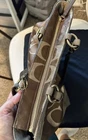 Coach purse/tote in metallic browns, suede and canvas, approx. 10x14. Handles in great condition. Clean on the inside and out, some beads missing around the top as shown in pic. Two barely noticeable spots as shown in pics, the pictures exaggerate the flaw. Otherwise excellent condition! Comes with dust bag. **Please feel free to message with any questions. **Check out my other listings, willing to bundle! **Smoke free, dog friendly home **Cross Posted**