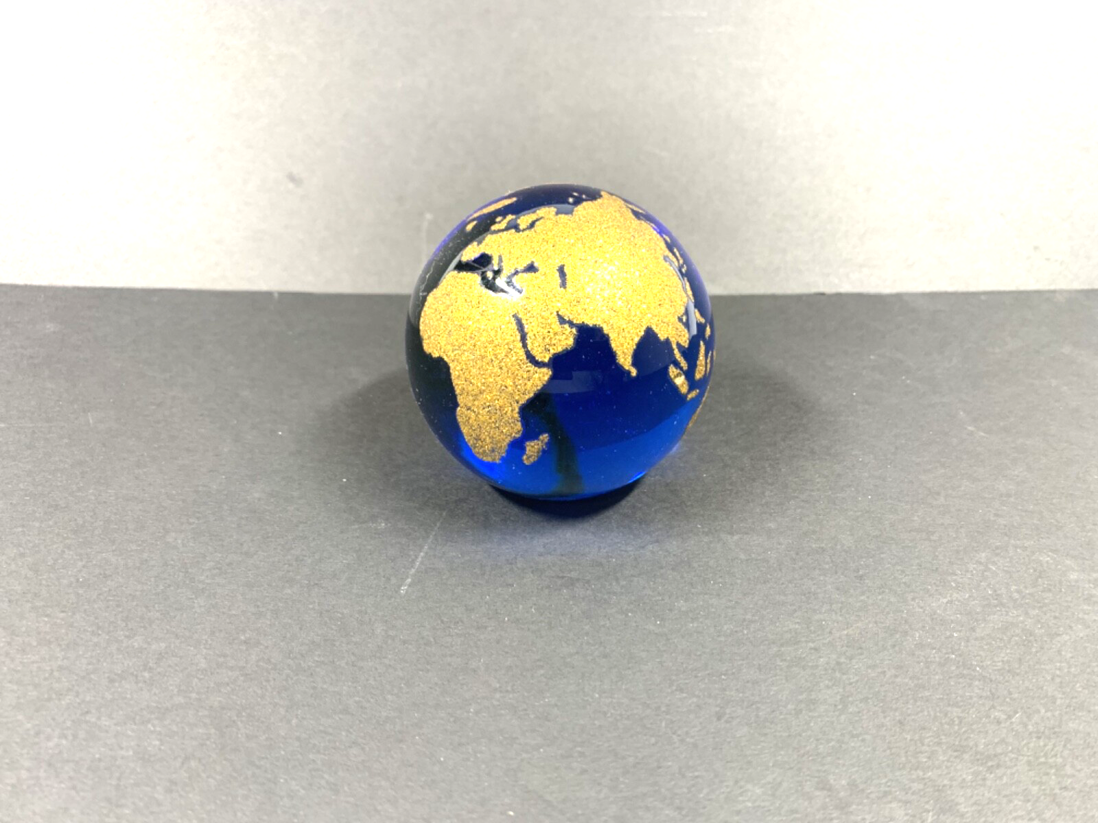 Experience the elegance of an artful desk accessory with the Cobalt World Globe Paperweight. This round glass sculpture captures the essence of the Earth with its vivid blue hue and detailed gold continents, offering a touch of sophistication to any workspace or display shelf. Crafted from quality glass with an art glass production style, the globe's brand remains unmarked, emphasizing its unique and artisanal charm. The paperweight's theme of Earth provides a thoughtful nod to our planet's beauty and the mystery of its origins, making it an ideal gift or collector's item for enthusiasts of globe decor and art glass aficionados alike. Please look at pictures for condition of item. Will not ship to Alaska or Hawaii and Puerto Rico If there is a problem please reach out to me to resolve any problems. Thank you for the order and I look forward to doing business.