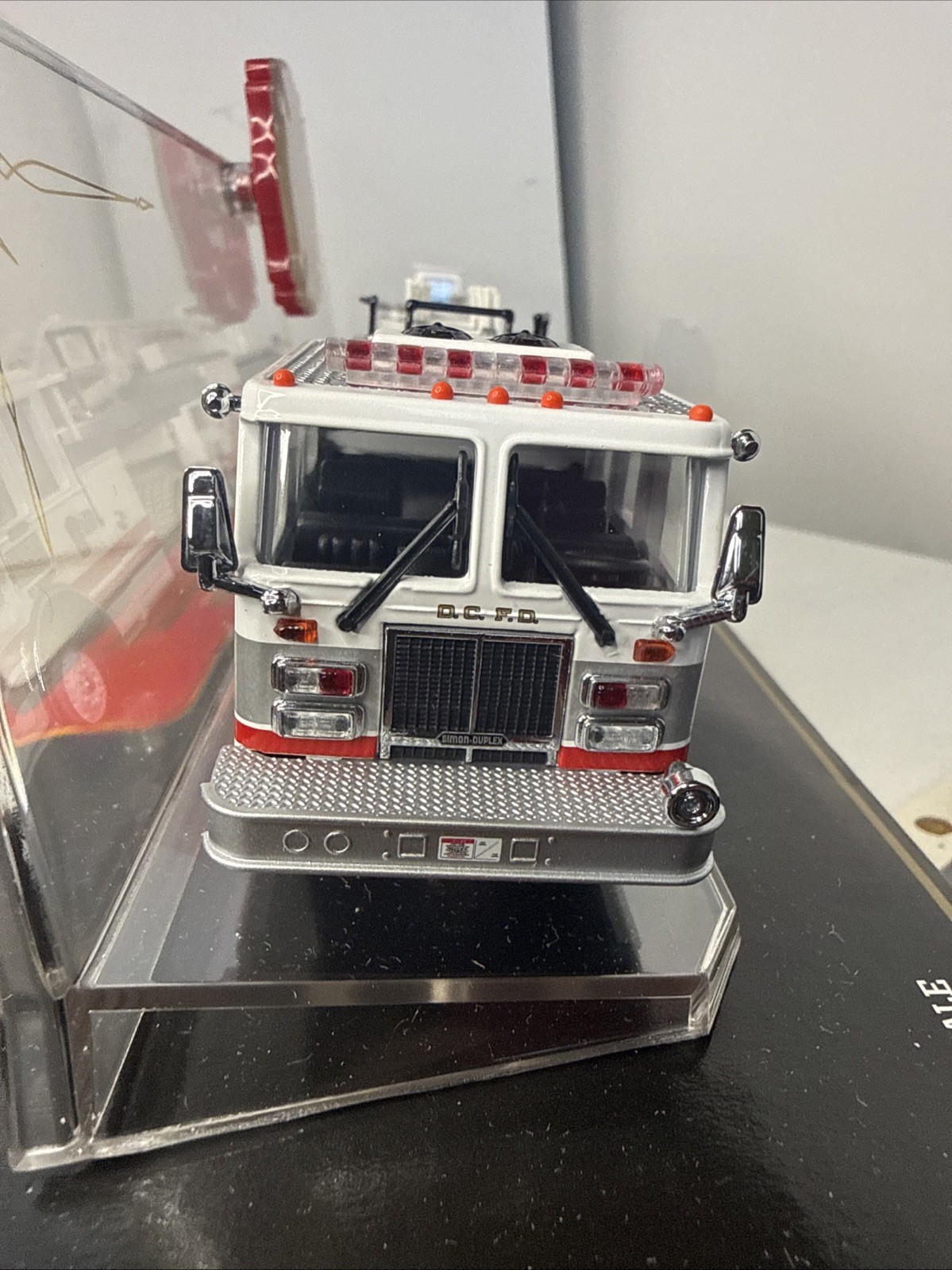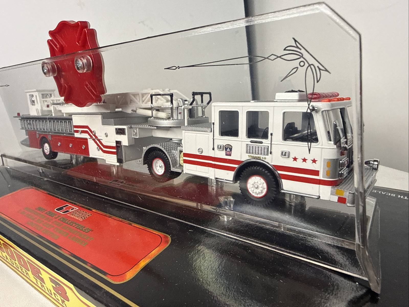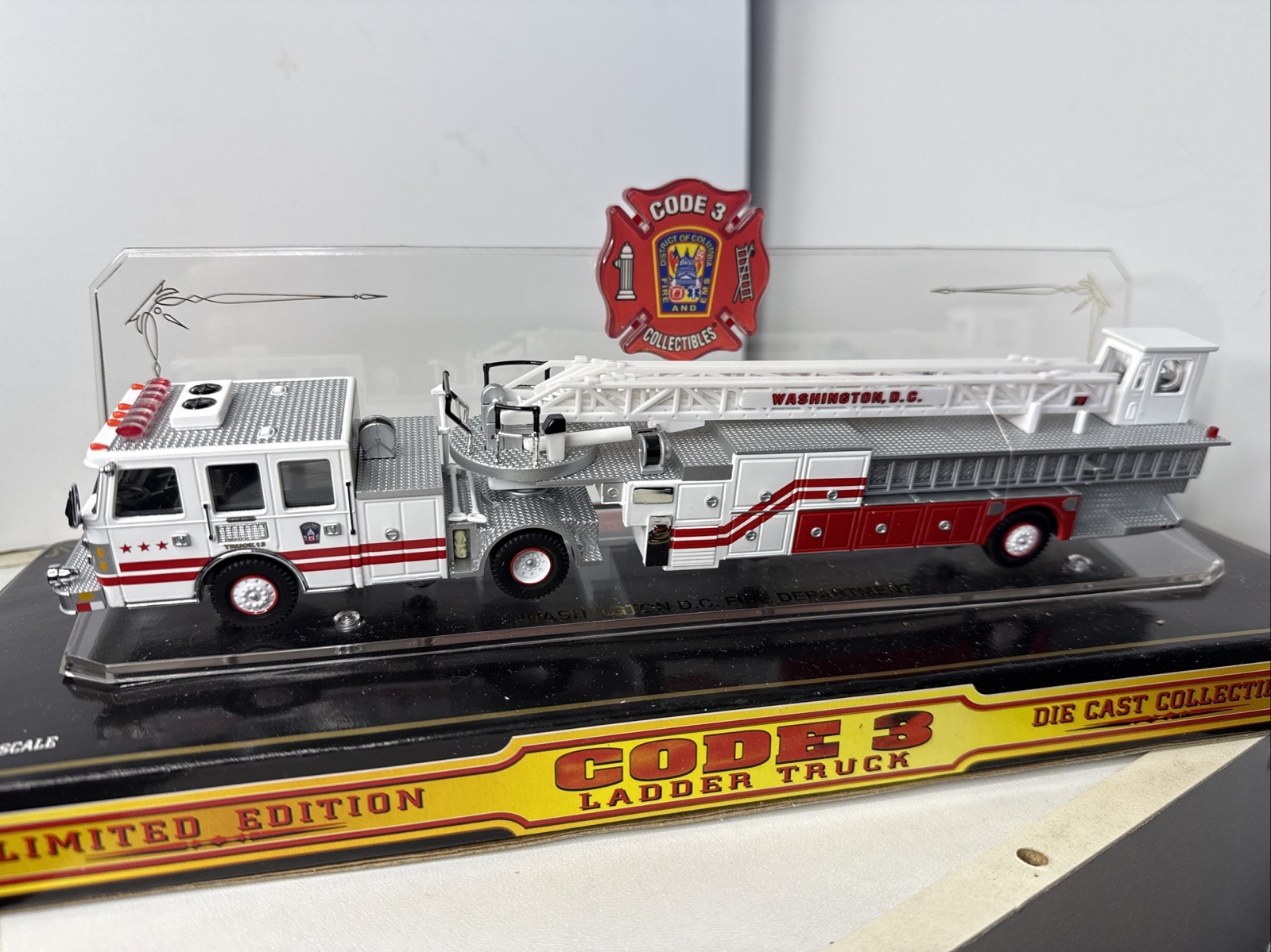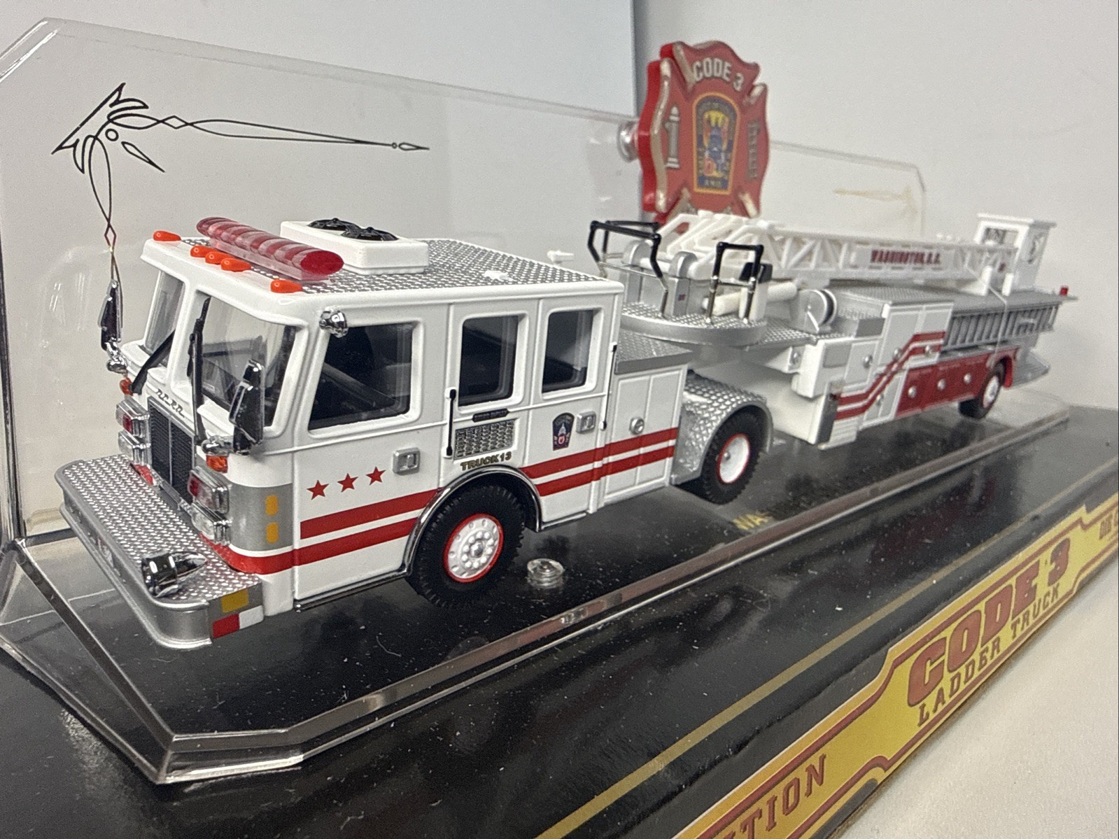 The Code 3 Washington DC Ladder Towers Fire Truck 13 is a rare die-cast toy vehicle in 1:64 scale, featuring a white Seagrave ladder fire truck from 1998. This limited edition collectible is part of the Fire & Rescue theme, making it a desirable item for both boys and girls aged 14 and up. The toy comes in an unopened box with a stand, perfect for display in any die-cast vehicle collection. Made in China by Code 3, this model (12659) showcases intricate details and is a must-have for fire truck enthusiasts. I HAVE RECENTLY ACQUIRED A LARGE DIECAST COLLECTION CONSISTING OF CODE 3 COLLECTIBLES FIRETRUCKS AND CONSTRUCTION EQUIPMENT SO PLEASE VISIT MY EBAY STORE EVERYDAY TO SEE LOTS OF COOL NEW ITEMS. ANY QUESTIONS PLEASE ASK SOME MOUNTING BASES MAY BE INCORRECT BUT ARE SECURE JUSTIN THE SUSQUEHANNA PICKER
