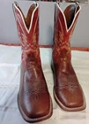 LIKE NEW CONDITION NO SCUFF ON TOE OR HEEL. THE SQUARE TOE GIVES ADD COMFORT. TOP IS Terricotta red with yellow gold stitch design bottom Portion is solid brown