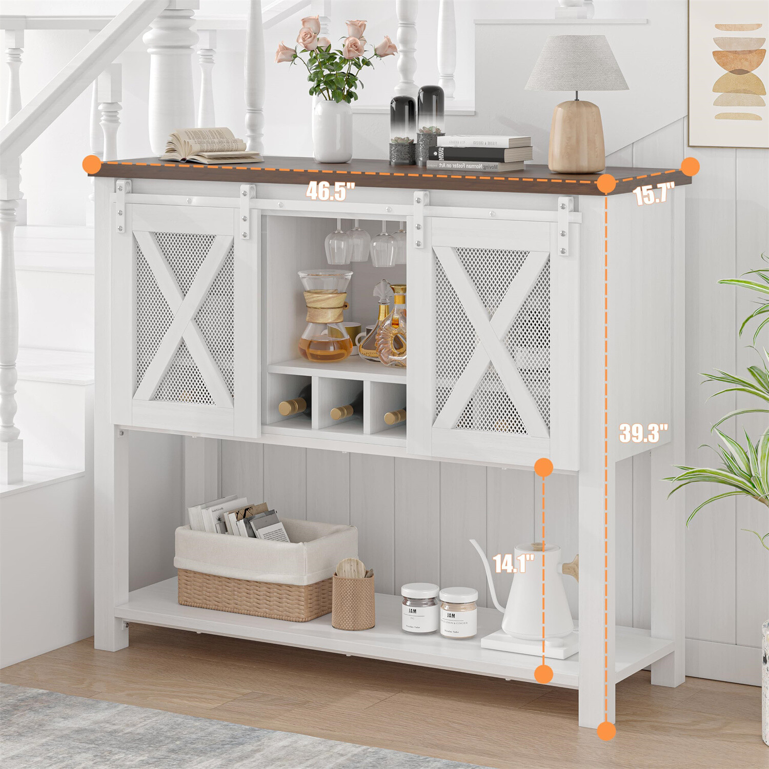 Ample Storage Space: This coffee bar cabinet is designed with dual open storage compartments, a pair of farmhouse-style cabinets, and a spacious 9-grid wine rack. The spacious open shelf of the sideboard cabinet can store your storage boxes and often-used items. Our coffee cabinet, complete with thoughtful storage solutions, boasts a vast storage area that is neatly organized. Premium Materials: The coffee bar cabinet with storage has overall dimensions of 46.5" L x 39.3" H x 15.7" W. Crafted from high-quality engineered wood and a strong metal frame, this buffet cabinet with storage is capable of supporting up to 250 lbs. The metal components of this kitchen cabinet is rust-resistant. The thick tabletop of coffee bar table is made of scratch-resistant and waterproof medium-density fiberboard (MDF), making it exceptionally easy to maintain. Multi-Use Cabinet: This versatile sideboard buffet cabinet is designed to accommodate your diverse needs across various occasions. The bar cabinet offers a 4-glass stemware holder and 9 individual wine grids, ensuring your collection is neatly organized. The kitchen buffet storage cabinet can be used not only as a liquor cabinet but also as a coffee station. The spacious tabletop is ideal for displaying coffee machines and cups, among other items. Farmhouse Coffee Bar: The storage cabinet features 2 sliding barn doors, showcasing a classic farmhouse-style design. These barn doors incorporate a visual mesh door design and are mounted on a metal track for smooth and quiet operation. This barn door cabinet is ideal for various spaces in your home, including the living room, dining room, kitchen, and entryway. Easy to Assemble: Our farmhouse coffee bar cabinet come with a detailed installation manual included in one package. All the accessories are labeled with numbers, and the precise positioning of holes makes installation accurate and swift. If you encounter any issues with the buffet cabinet with storage, please feel free to contact us! Product Description Why is our coffee bar cabinet worth choosing? 1. Constructed with high-quality MDF board and a strong metal frame, our coffee bar cabinet with storage is engineered for lasting stability. 2. With the well-organized compartments, our farmhouse coffee bar cabinet is thoughtfully designed to provide ample storage space. 3. Our buffet cabinet with farmhouse style design is ideal for your home, including the kitchen, dining room and entryway. Bar Cabinet with Storage Crafted with meticulously designed glass and wine racks, our bar cabinet provides ample space for up to 9 bottles of your red wines. This thoughtful layout guarantees that your treasured vintages are always within easy reach. Equipped with a spacious open shelf beneath, our sideboard cabinet offers a convenient storage solution for your everyday essentials. This functional addition not only enhances the cabinet's utility but also significantly expands your organizational options. Stronge Support Legs Graced with four robust and high-quality engineered wood legs,our farmhouse cabinet boasts outstanding stability and support. Wine Glass Holder Inside the liquor cabinet, a thoughtfully designed 4-glass stemware rack offers a dedicated space for your wine glasses, keeping them both dry and conveniently accessible. Sliding Barn Doors Boasting dual X-design barn doors, our storage cabinet glides open effortlessly on a smooth and whisper-quiet metal track, ensuring a tranquil user experience. Payment Delivery details Terms of sales About us Contact us Payment We accept payment either via PayPal or any of the following credit cards; Visa, MasterCard, Discover, and American Express. Wishing you a happy life! Delivery details We will provide you with the tracking number on the same day or the next day, and transport your package through UPS, DHL, FedEx and other courier methods. If you have any questions, please feel free to contact me and I will do my best to help you solve the problem. Wishing you a happy life! Terms of sales We offer a one month free return and exchange service, and you don't have to bear any losses. We will provide multiple solutions for you to choose from. If you have any questions, please feel free to contact me and I will do my best to help you solve them. We offer a two-year warranty period. If you have any quality issues with the product you purchased within two years, please feel free to contact me. I will provide you with a free replacement service. If you have any questions, please feel free to contact me. I will do my best to help you solve the problem. Wishing you a happy life! About us We are committed to becoming the best eBay seller, with high-quality suppliers, providing the most sincere service, including pre-sales and after-sales service, to give you a satisfactory shopping experience. If you have any questions, please feel free to contact me, and I will do my best to help you solve the problem. Wishing you a happy life! Contact us If you encounter any problems, please contact me by email at the first time, I will provide you with a solution as fast as possible so that I can give you a satisfactory shopping experience, wish you a happy life! Type Bar Cabinet Brand grvee Material Engineered Wood Mounting Free Standing Features Coffee Bar Cabinet Manufacturer Warranty 5 Years Product Dimensions 15.7"D x 46.5"W x 39.3"H