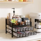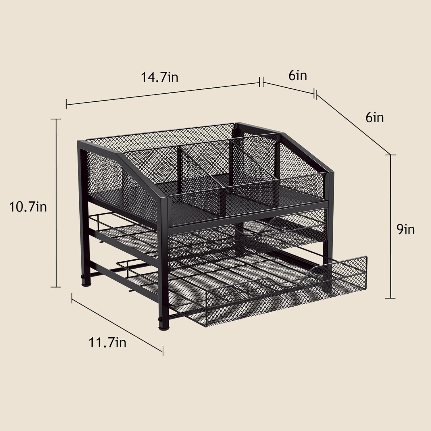Product Description: Transform your morning routine with this coffee bar organizer , designed to turn your countertop into a stylish and functional coffee station. Keep coffee pods, tea bags, sugar packets, stirrers, syrups, and cups neatly organized, so every morning starts smoothly with everything within reach. Crafted from solid wood and durable metal mesh , this coffee station is both practical and elegant . The food-safe finish ensures safe storage for cups, creamers, and condiments, while the sleek black design enhances any coffee nook or office breakroom. The thoughtful design makes it easy to access every last pod or tea bag without digging through clutter. Its adjustable anti-slip feet provide a stable setup, and the waterproof surface ensures spills and messes are easy to clean—keeping your coffee corner neat and stress-free. Perfect for home kitchens, office breakrooms, hotel lobbies, or café setups , this coffee bar organizer maximizes space while keeping everything organized in one stylish station. Key Features Effortless Organization – Keeps coffee pods, tea bags, syrups, stirrers, and cups neatly arranged. Durable Materials – Crafted from solid wood and metal mesh for lasting use. Food-Safe Finish – Safe for storing cups, creamers, tea, and other coffee essentials. Stable & Anti-Slip – Adjustable feet prevent sliding and wobbling. Waterproof Surface – Easy to clean and maintain for a mess-free setup. Compact Countertop Design – Perfect for small or large coffee corners. Versatile Use – Ideal for home, office, hotel, or café coffee stations. Stylish Aesthetic – Sleek black finish blends seamlessly with any décor. Easy Access – Thoughtful layout allows you to grab the last pod or tea bag easily. Product Details Material: Solid Wood + Metal Mesh Finish: Black, Food-Safe Coating Storage: K Cups, Tea Bags, Cups, Syrups, Condiments Use: Countertop Coffee Bar Organizer Features: Anti-Slip Feet, Waterproof Surface Frequently Asked Questions (FAQs) 1. Can this organizer hold K Cups and tea bags? Yes, it’s designed to store both K Cups and tea bags neatly. 2. Is the surface food-safe? Yes, the finish is food-safe, perfect for storing cups, creamers, and tea bags. 3. Will the organizer slide on my countertop? No, the adjustable anti-slip feet keep it stable on most surfaces. 4. Can it be used in an office or hotel setting? Yes, it’s ideal for home kitchens, office breakrooms, and hotel coffee stations. 5. Is it easy to clean? Yes, the waterproof surface allows for quick wiping of spills and messes. 6. What materials is it made from? It is made of solid wood with a durable metal mesh construction. 7. Can it hold cups and syrups too? Yes, the compartments are designed to store cups, syrups, and condiments conveniently. 8. Is the organizer compact enough for small spaces? Yes, its countertop-friendly design maximizes storage without taking up too much space. 9. Does it have a modern look? Yes, the sleek black finish and combination of wood and metal create a stylish, contemporary appearance. 10. Can I access the last coffee pod easily? Yes, the thoughtful design allows easy access to the bottom pods without digging. 11. Will it wobble if I bump the countertop? No, the anti-slip feet ensure the organizer stays firmly in place.