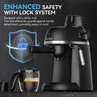 The 3.5Bar Steam Espresso Coffee Machine is a compact and user-friendly appliance designed for coffee enthusiasts seeking café-style beverages at home or in the office. Its sleek black design and lightweight construction (weighing only 3.3 lbs) make it an ideal addition to any kitchen or workspace. Equipped with a 3.5-bar steam pressure system, this machine efficiently brews rich espresso and features a milk frother for crafting creamy cappuccinos and lattes. The 240ML water tank allows for multiple servings without frequent refills, and the removable drip tray ensures easy cleaning. The Tritan water cup is durable and safe for daily use. Whether you’re preparing a quick espresso to start your day or entertaining guests with specialty drinks, the 3.5Bar Steam Espresso Coffee Machine offers a convenient and enjoyable coffee-making experience. Fast Brewing Technology: With 3.5 bar professional pressure, the 800W heating system quickly extracts espresso in just 2 minutes. Enjoy fresh coffee without waiting. Perfect for morning commutes or afternoon breaks. Tip: For optimal performance, allow the machine to cool down between multiple brews. This ensures consistent temperature and extraction quality Compact Design: At just 8.3”D x 6”W x 11.8”H and 3.3LB, this space-saving machine fits seamlessly in small kitchens or offices, delivering quality coffee anytime without crowding your counter. Note: Designed for simplicity and efficiency, ideal for users seeking a compact and straightforward espresso solution Adjustable Steam Wand: The powerful, adjustable steam wand effortlessly creates smooth, dense milk froth, making you a home barista for cappuccinos and lattes. Features a heat-resistant short tube for safe operation, easy cleaning, and includes a red pin to unclog the wand when needed. Tip: If the wand feels stiff, gently twist while attaching or detaching. Use the included red pin to clear any blockages. Not recommended for users with limited hand strength One Touch Knob: Simplified single knob operation lets you power on, brew coffee, and froth milk with one dial. User-friendly for all ages. The handle is equipped with a built-in portafilter locking clip, enabling you to effortlessly knock out used coffee grounds and eliminating the hassle of manual scraping. Note: The locking mechanism requires a firm but gentle turn. Avoid forcing the handle. Suitable for standard ground coffee—avoid overly fine or oily blends to prevent clogging Dual Safety Features: Includes BPA free Tritan cups that are durable, lightweight, and odorless, preserving coffee’s pure flavor with clear measurement markings for precise pouring. The integrated safety lock visually ensures proper handle installation, preventing incomplete extraction from improper setup and safeguarding both coffee quality and user safety. Tip: Ensure the handle is fully locked into place before brewing. If coffee leaks, check the seal and alignment Tips: To ensure the best coffee flavor, please use dark roast, medium-coarse ground coffee, filling to the 4-cup mark on the filter basket. During brewing, stop when coffee reaches the second mark on the carafe to prevent excess water from weakening the taste