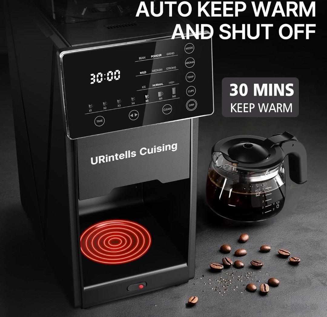 This Coffee Maker w/ Grinder is like new. Used one time and cleaned thoroughly. Looks like new. Works as it should. Makes hot or iced coffee. In original box w/ instructions. Brand is URintells Cuising Model is CM6110-US The product is a programmable hot and cold coffee maker that comes with a grinder, carafe, filter, grinder conical burr, brush, and powder funnel included. It can make 22 oz of coffee and is designed for everyday use in various settings like home and office. The coffee maker is a modern style with a matte finish and has automatic shutoff for safety. The programmable feature allows for convenient scheduling, and the touch control method makes it easy to use. Made of plastic and glass, this coffee maker is a sleek and functional addition to any kitchen or workspace.