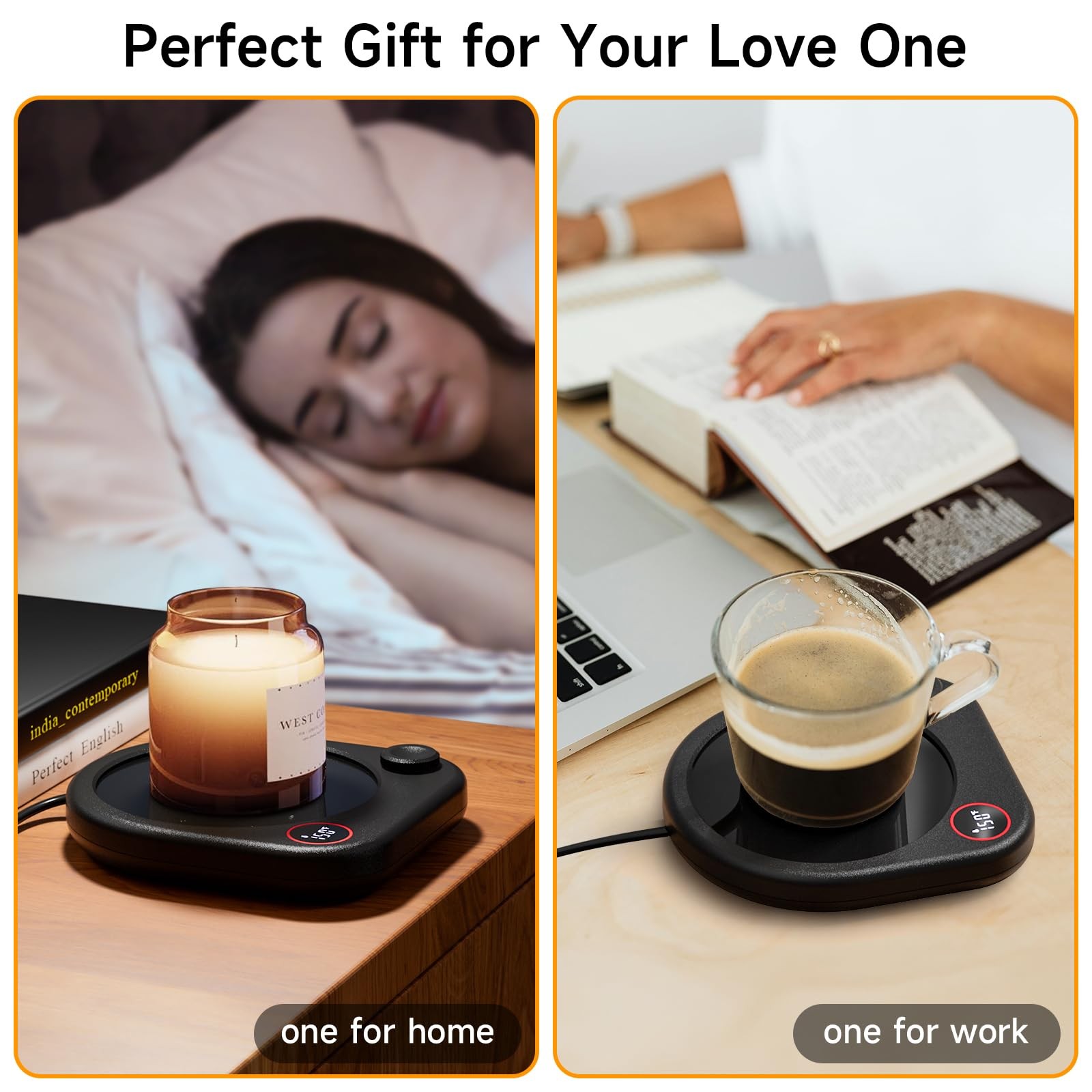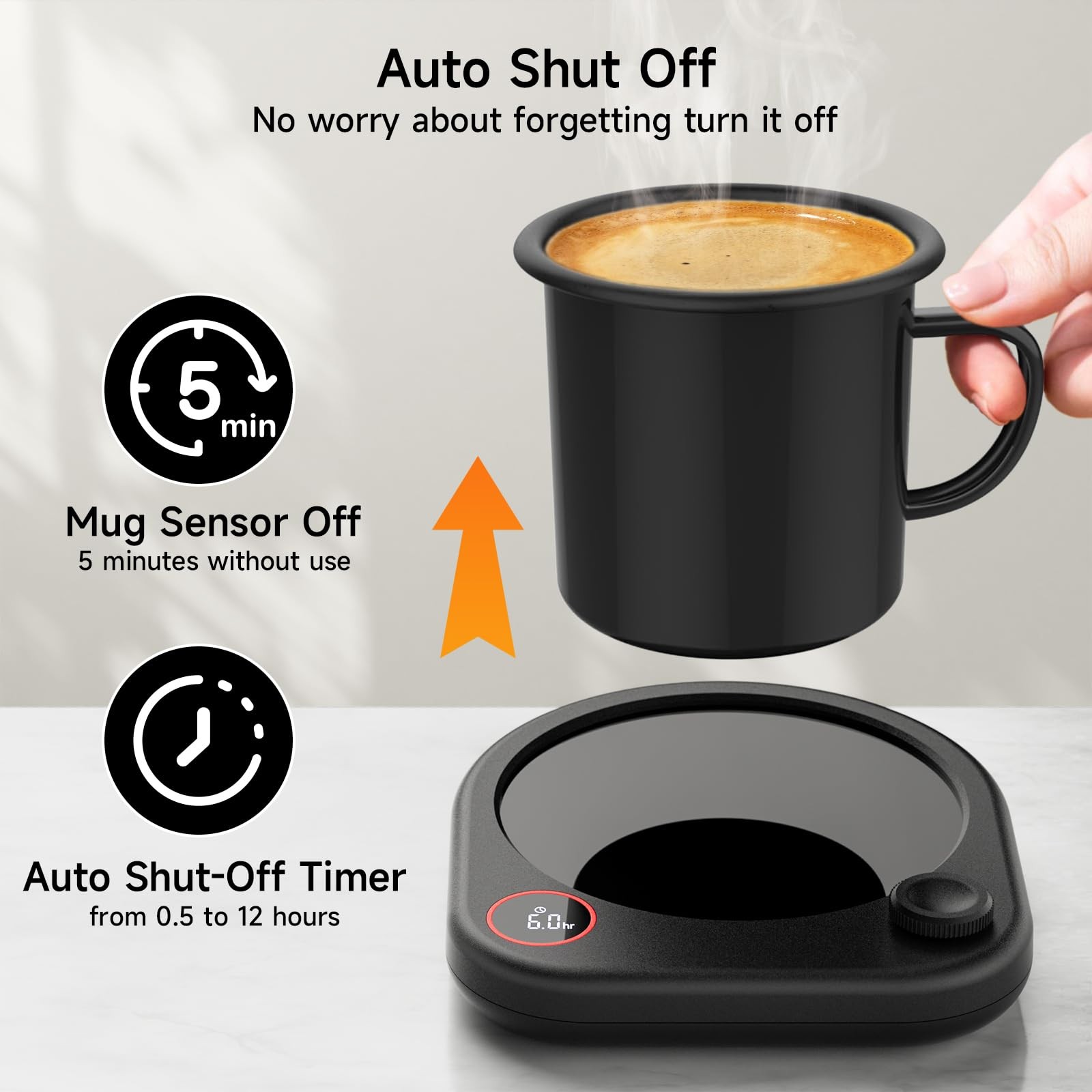 Coffee Mug Warmer 【Easy to Use】Simply plug it in, press the switch, and place your mug on the warmer. That's it! With just one button, you can control the temperature settings and timer. Our mug warmer heats up instantly, keeping your coffee hot from the first sip to the last. Enjoy your coffee without needing to reheat it in the microwave. 【Customizable Temperature】 Unlike other brands that only keep beverages lukewarm, our warmer ensures your drinks stay hot and satisfying. You can adjust the temperature in 1-degree increments, from 113°F to 150°F, by rotating the knob. This high level of customization elevates your coffee routine and experience. 【Safety is the Priority】 Our warmer is equipped with a mug sensor that activates a breathing light ring when your mug is lifted, indicating standby mode. It automatically shuts off after 5 minutes of inactivity, so you never have to worry about forgetting to turn it off. Additionally, it features a shut-off timer, with a default auto turn-off time set at 6 hours. You can easily adjust this timer every half hour, from 0.5 to 12 hours, for added convenience and energy efficiency. 【Compact Design】 Featuring a large 4-inch heating panel, our warmer is suitable for most coffee mugs, teapots, or large candles, while maintaining a small footprint. The 5-foot extra-long cord makes it perfect for your desk, saving workspace and keeping your environment clutter-free. This elegant design is also a fantastic gift option for birthdays, holidays, anniversaries, graduations, and special occasions, adding both style and functionality to any setting. 【Mug Included】 Our set includes a 17 oz black enamel mug with a completely flat bottom, ensuring long-lasting coffee enjoyment. The metal material is an excellent heat conductor, allowing your coffee to reach a high temperature. This elegant set will elevate your coffee experience.