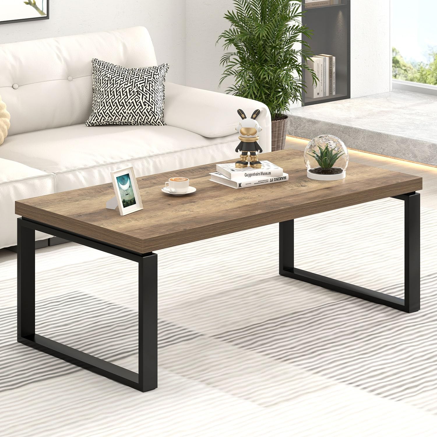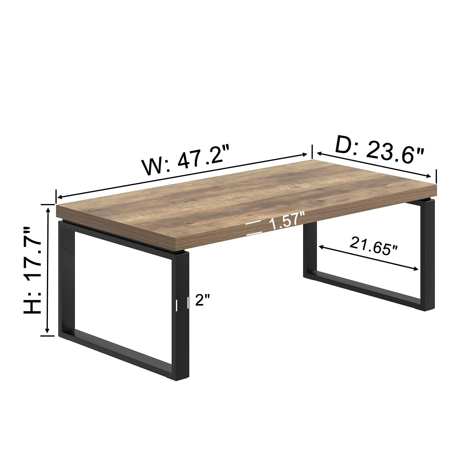 Coffee Table, Modern Wood and Metal Living Room Table, Industrial Rectangle Center Table for Home Office, Rustic Oak, 47 Inch Rustic Modern Style: This coffee table features a rustic oak wood grain surface and black powder-coated metal legs. Its simple clean lines and unique, minimalist design suit modern industrial styles, making it a versatile centerpiece for your living room Sturdy Construction: Crafted from premium MDF top and robust metal legs, this rectangle coffee table supports up to 300 lbs. Its open structure offers excellent stability while providing room for stretching your legs, making it practical for everyday use Quick Assembly in 5 Minutes: This wood coffee table comes with all necessary hardware and illustrated instructions for hassle-free assembly. Designed for convenience, it takes just 5 minutes to set up, so you can enjoy your new center table in no time Versatile Use: Use it as a center table for living room, a cocktail table for gatherings, or a tea table for relaxing. This modern living room coffee table fits seamlessly into offices, lounges, or reception rooms, adding a contemporary and simple charm to your space Dedicated to Your Satisfaction: Ensuring your satisfaction is our top priority. If you have any concerns with this wooden coffee table, please let us know, and we'll respond promptly within 24 hours. Enjoy peace of mind with our 12-month quality coverage