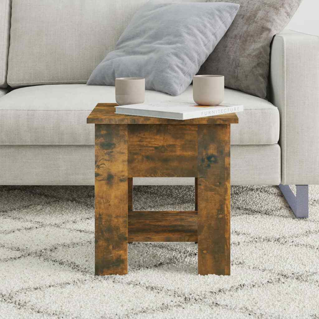 This stylish coffee table featuring a modern design is a practical addition to your current living space. This side table can keep your living space free of clutter thanks to its storage shelf which are perfect for placing books, magazines, or small essentials you'd like to keep within reach. The sturdy tabletop is also ideal for placing your drinks, food and other decorative items. Additionally, the living room table is easy to clean with a damp cloth. Color: Smoked oak Material: Engineered wood Dimensions: 15.7" x 15.7" x 16.5" (W x D x H) Assembly required: Yes California Proposition 65 Warning: This product can expose you to chemicals including wood dust, which is known to the State of California to cause cancer. For more information go to . Shipping Restrictions Due to the limited access of our couriers, this item cannot be delivered to the following locations: Alaska Federated States of Micronesia Guam Hawaii Marshall Islands Military Posts (APO / FPO) Palau Puerto Rico US PO BOX Virgin Islands Our customer support will contact buyers for orders with no shipment service, and these orders will be cancelled and fully refunded afterwards.