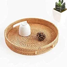 Large Size: 14 inch Diameter x 2.8 inch Height; Package include 1PCS of Circular Tray Material: The tray is made of 100% rattan, hand woven, built in handles for easy carrying and serving The round tray is designed with natural rustic color, simple but elegant design for decoration, fits most home, kitchen, farmhouse, tea room or coffee room Multifunctional: could be used as ottoman / coffee table / side table tray, food / drink / fruit serving basket; Also could simply used on the tabletop or center of kitchen island to holds keys, mail, remote controls, assemble plants, napkins, salt and pepper and other small stuff The rattan tray is very easy to clean, just need wipe clean with damp cloth