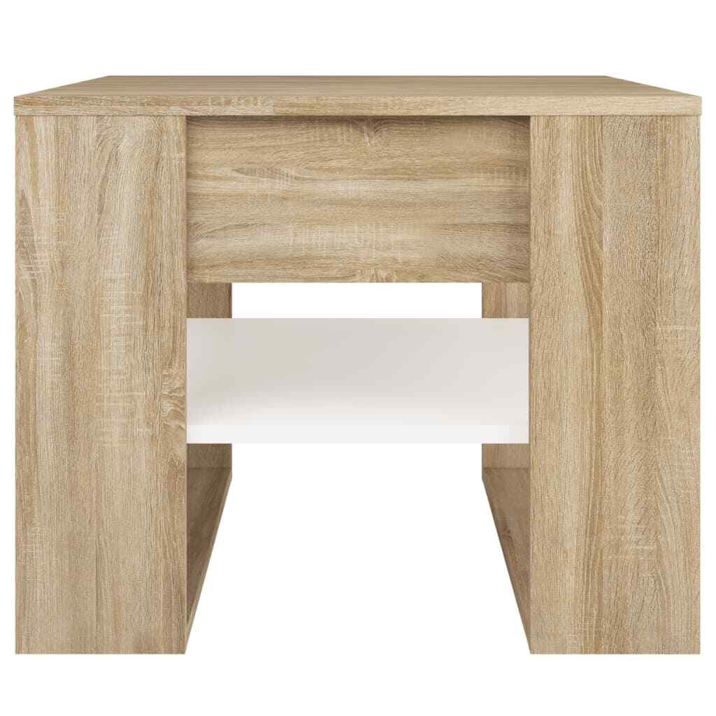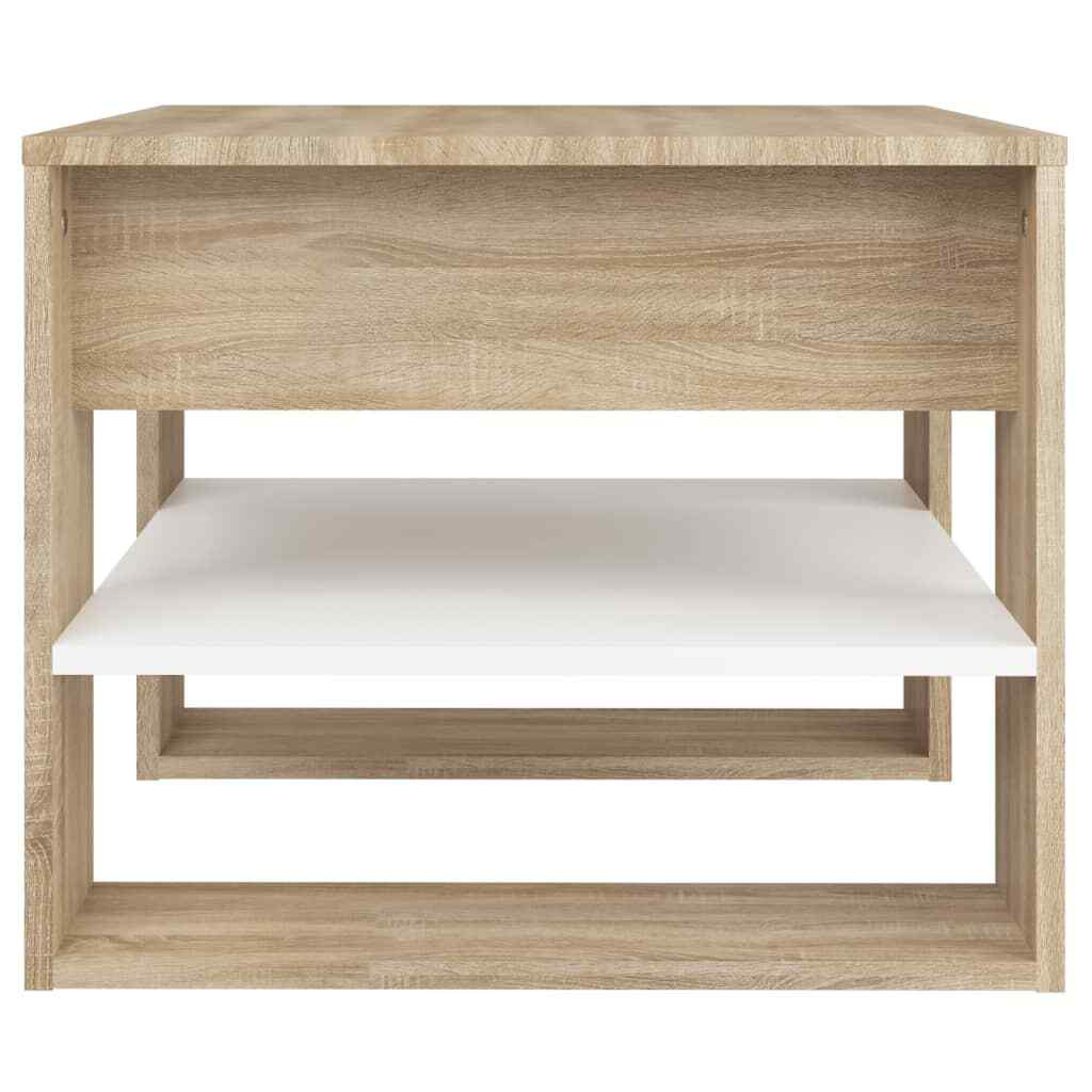 An essential part of every living space: coffee tables! Bring this coffee table to your home right now! Premium material: The engineered wood is of exceptional quality with smooth surface and also features strength, stability and resistance to moisture. Ample storage space: This coffee table can keep your living space free of clutter thanks to its storage shelf. It is perfect for placing books, magazines, or small items you'd like to keep within reach. Practical tabletop: The tabletop provides a secure surface to place snacks, drinks, vases, fruit bowls, or other decorative items. Color: White and sonoma oak Material: Engineered wood Dimensions: 21.9" x 21.7" x 17.7" (W x D x H) Assembly required: Yes California Proposition 65 Warning: This product can expose you to chemicals including wood dust, which is known to the State of California to cause cancer. For more information go to . Shipping Restrictions Due to the limited access of our couriers, this item cannot be delivered to the following locations: Alaska Federated States of Micronesia Guam Hawaii Marshall Islands Military Posts (APO / FPO) Palau Puerto Rico US PO BOX Virgin Islands Our customer support will contact buyers for orders with no shipment service, and these orders will be cancelled and fully refunded afterwards.