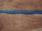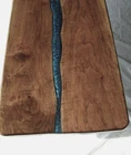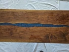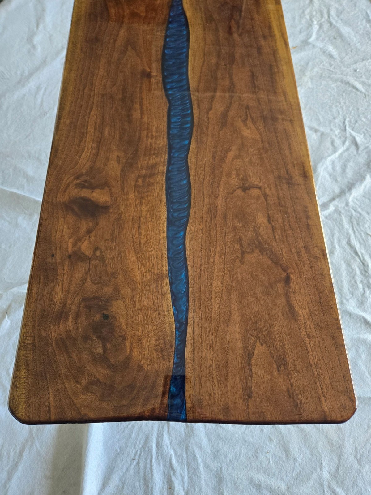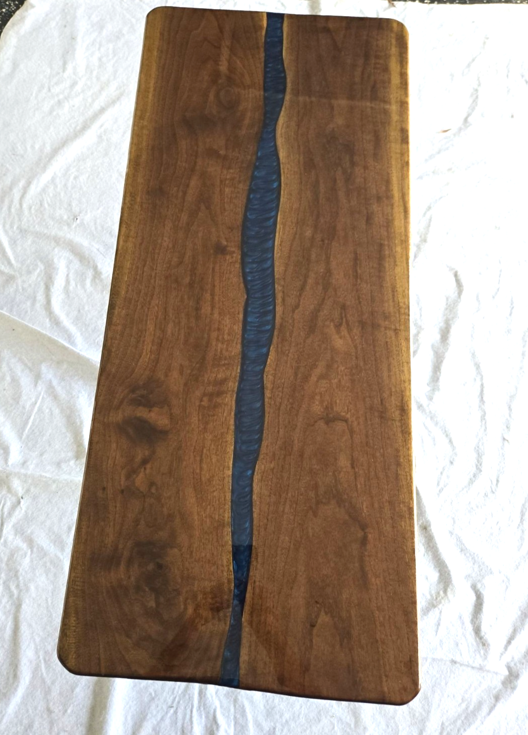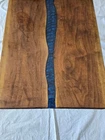 Custom made New Coffee Table made from beautiful Black Walnut Hardwood slabs, with center River pour. Size, Approx. 46” long , 20 wide, 1- 1/4 thick. Table made of 2 pc Blk Walnut wood slabs. Table comes predrilled for X style legs 16 in tall, included Both sides of the table are completely covered with clear epoxy or poly.
