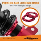 carpartsharehouse Home | Contact us | Promotion Fast hipping International Shipping 30 Days Return Policy Secure Shopping Coilover 24 Level Adjustable Damper Shocks For Toyota Corolla 2009-2018 Most Competitive Price Manufacturer We know our products Easy Return Quick, Simple Guaranteed Fitment Always the correct part DESCRIPTION Maxpeedingrods' street coilovers are designed and developed for all motoring enthusiasts that want excellent handling without sacrificing comfort. This suspension system is ideal for daily driving and occasional, light track use. High quality components are adopted to ensure product durability and stability. Each application is fully test fitted and completely road tested to guarantee all our customers perfect performance and comfort expectations. Features Ride Height Adjustable - Drops From 1 to 3 Inch From Factory Ride Height Damping Force Adjustable - 24 Levels From Soft To Stiff High Rigidity 55CrSi Steel Cold-bent Coil Springs - Over 600k Continuously Stress Test With 0.04% Distortion Rate Top Camber Plate with Pillow Ball Mount Provides More Precise Feel From Suspension And Steering Anti-Corrosion Finish - Anodized Aluminum And Powder Coated Carbon Steel Parts Quality Assured - Full Year Limited Warranty From Date of Purchase Fitment For TOYOTA COROLLA (E140) AZE141L XRS 2009-2010 For TOYOTA COROLLA (E140/E160) ZRE142L LE 2009-2013 For TOYOTA COROLLA (E150/E170) ZRE172L all 2014-2019 For TOYOTA MATRIX (E140) LE 2009-2014 Specification - Top mounts: pillow ball top mount with camber plate front, standard rubber top mount rear. - Damping: 24 levels rebound damping adjustable - Spring rate Front: 10 kg/mm (560 lbs/in) - Spring rate Rear: 6 kg/mm (336 lbs/in) - Spring length Front: 200mm - Spring length Rear: 160mm - Adjustable height: lowering 1-3 inch - Coilover overall length Front: 360mm-455mm - Coilover overall length Rear: 313mm-370mm - Shock type: Twin tube - Spring Preload: 7-10 mm - Color: red Package included 1 x Set of Coilover Spring Kit (2 Front + 2 Rear) 1 x Pair of wrenches for height adjustment ★ 30-day Money Back & 12-Month Replacement Guarantee. Please feel free to contact us if there is any question. Height Adjustable Lowering Kit; 24 Clicks of Rebound Damping Force Adjustment; Independent Ride Height And Spring Tension Settings; High Rigidity 55CrSi Steel Cold-bent Springs; Anodized Shock Body With Anti-Corrosion Coating; Top Camber Plate with Pillow Ball Mount Provides More Precise Feel From Suspension And Steering; Full 1 Year Limited Warranty From Date Of Purchase. SHIPPING US Domestic Shipping Notice - All items will be dispatched within 24hrs(Mon-Fri) Our carrier collects all the parcels at 4:30am PDT, any payment paid after 5:00am PDT will be shipped the next day at 4:30am PDT. If you paid Item Shipped On Est.Delivery Time Before Apr. 1st at 4:30am Apr. 1st at 5:00am Apr. 5th - Apr. 7th After Apr. 1st at 4:30am Apr. 2nd at 5:00am Apr. 6th - Apr. 8th If our estimated delivery time and eBay’s are contradictory,please refer to the standard delivery time of ours. Estimated Delivery Time From To Service Est.Delivery Time US US UPS or Fedex Ground 3-5 Business days Outside of US DHL FedEx 4-7 Business days Please provide the following shipping information for your order Otherwise your shipment will be deferred. We are not responsible for any shipping lost caused by wrong shipping information International Shipment For international shipment, we do not cover any import taxes or duties. Import tax is charged by the government, not us. Our item price and shipping cost do not include any import tax which will be charged by the shipping company when you got the parcel. Please be noted that is not the extra shipping fee. WARRANTY We aim to provide you the good buying experience, 30 days return policy is offered in our store. Please follow our return policy before you return any item(s): If you are unhappy with your purchase for any reason, you can return it to us in an un-used condition in the original packaging within 30 days of purchase and we'll give you a refund or exchange. The refund/Exchange will not include postage/eBay costs. Please note you MUST contact us to obtain a Return Authorization Number before returning any part. Any parcel without the Return Authorization Number will be rejected. If your item is faulty or was incorrect, you must contact our sales representative before returning the parcel and we will endeavour to solve the problem effectively. Video or picture is required to show the item condition before we issue the Return Authorization Number. All VehicalPartsLearder products have 2 year warranty (unless otherwise stated) Important notice: 1. Any returned item(s) without Return authorization number will be rejected. 2. Please return your item(s) in original packaging and ensure that all packages are securely wrapped 3. We will not accept responsibility for loss or damage of goods during transit, please ensure that the insurance cover option is taken where possible 4. Upon receipt, all products will be inspected at our discretion in 3-5 business days. Then, the updated result will be informed. If you have made a mistake on purchase and wish to cancel the order before it is dispatched please contact us by ebay message as quickly as possible. Note: All parcel will be collected by carrier at 8:00am on Monday to Friday. F A Q Will this fit my car? We have used the eBay compatibility list as a guide for buyers to use, but the eBay data system is not accurate and incomplete sometimes. Please make sure you have read through the whole listing and paid attention to “note” and “notice”. If there is any uncertain, please use the eBay message to check with our sales first. How much does delivery cost and how long will it take? You can check the delivery cost in the listing “Shipping and payments” section by selecting your country and entering your zip code. If it is not specified, please provide us your shipping address 