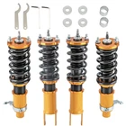 Features - 24 Step to adjust soft / hard adjustment according to your preference - Ride Height Adjustable - Drops From 1 to 3 Inch From Factory Ride Height - 55CrSi high strength durable cold wound steel & heat treated coils - Manufactured from high quality T-6061 billet aluminum with an anodized finish for superior strength and corrosion protection. - Improved Handling and stability without premature tire wear - Improved Vehicle Stability and traction in hard cornering situations - Full threaded absorber tube casing for independent height adjustment - Twin-Tube System for Comfortable Ride on Streets Application For Honda Civic / CRX 1988-1991 EE EF EC For Honda Civic 1992-1995 EJ EG EH fork type For Honda Civic 1996-2000 EK For Acura Integra 1990 -1993 DA DB fork type For Acura Integra 1994-2001 Specifications - Front and Rear top mount: rubber - Damping: 24 levels rebound damping adjustable - Spring rate Front: 8 kg/mm (448 lbs/in) - Spring rate Rear: 5 kg/mm (280 lbs/in) - Spring length Front: 180mm - Spring length Rear: 180mm - Adjustable height: lowering 1-3inch - Coilover overall length Front: 365mm-410mm - Coilover overall length Rear: 435mm-480m - Shock type: Twin tube - Spring Preload: 7-10 mm Package included - Complete 2 Front + 2 Rear coilovers - A pair of wrenches for height adjustment - For some vehicles, you will need sleeves and washers that already included in our package.