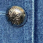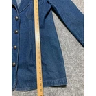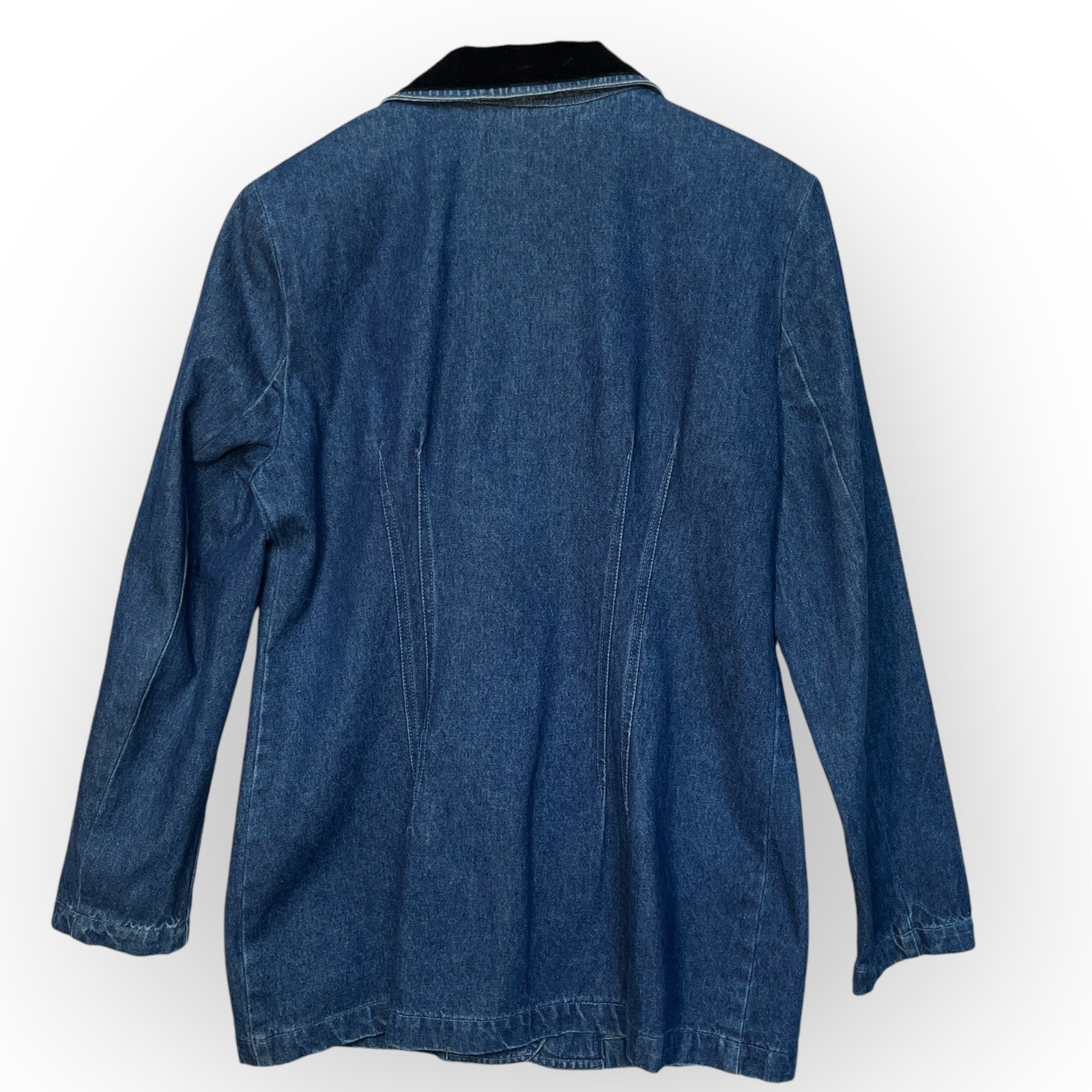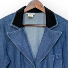 Classic denim blazer jacket with a sophisticated black velvet collar and ornate silver button closure. Tailored seams create a flattering silhouette. A chest pocket adds a touch of utility to this versatile piece. Perfect for casual outings or layering for a smart-casual look. Made in USA. Type: Blazer Outer Shell Material: Cotton Style: Basic Jacket Department: Women Lining Material: 100% Cotton Accents: Button Features: Pockets, Single-Breasted, Lined Fabric Type: Denim Pattern: Solid Season: Spring, Fall Closure: Button Occasion: Casual, Workwear Sleeve Length: Long Sleeve Fit: Regular Keywords: denim jacket, blazer, velvet collar, silver buttons, women's fashion, tailored, smart casual, outerwear, vintage style, everyday wear, layering piece, classic