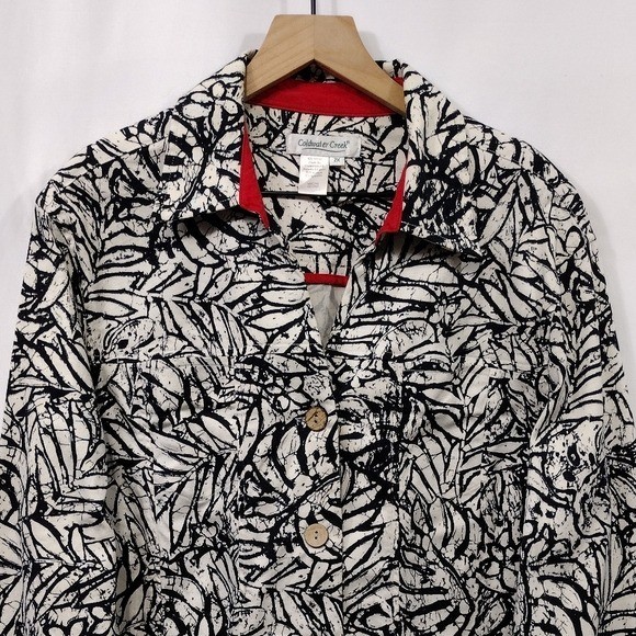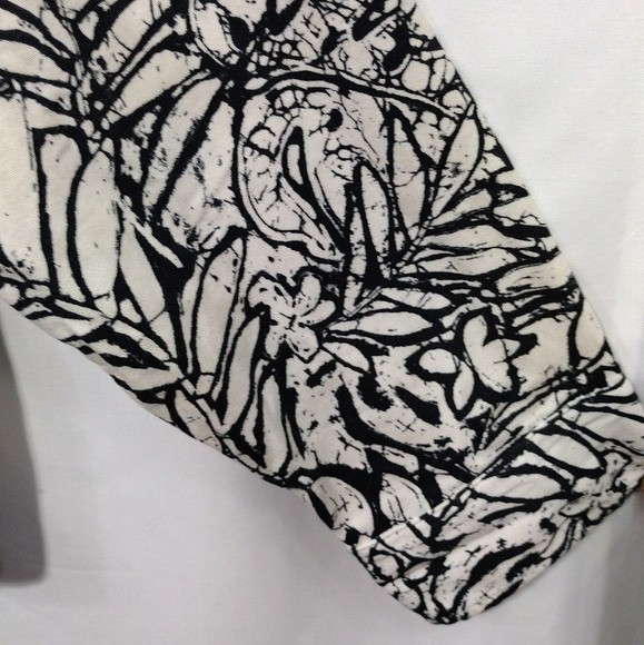 Chic jean jacket with bold leaf pattern. Features button closure and classic collar. Ideal for casual elegance. Features Black White Floral Leaves Collared Button front Boho Retro 90s Y2K Casual Comfy Artsy Cotton/Spandex Great Pre-Loved Condition SIZE 2X Measurements Pit to Pit: 22.5" Length: 25" Waist: Rise: Inseam: Length: Please check to be sure of fit Smoke Free Pets Free Please feel free to contact me for any questions or offer Bundle Discounts Offered Fast Shipping *5913-1304-25*