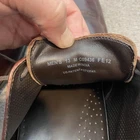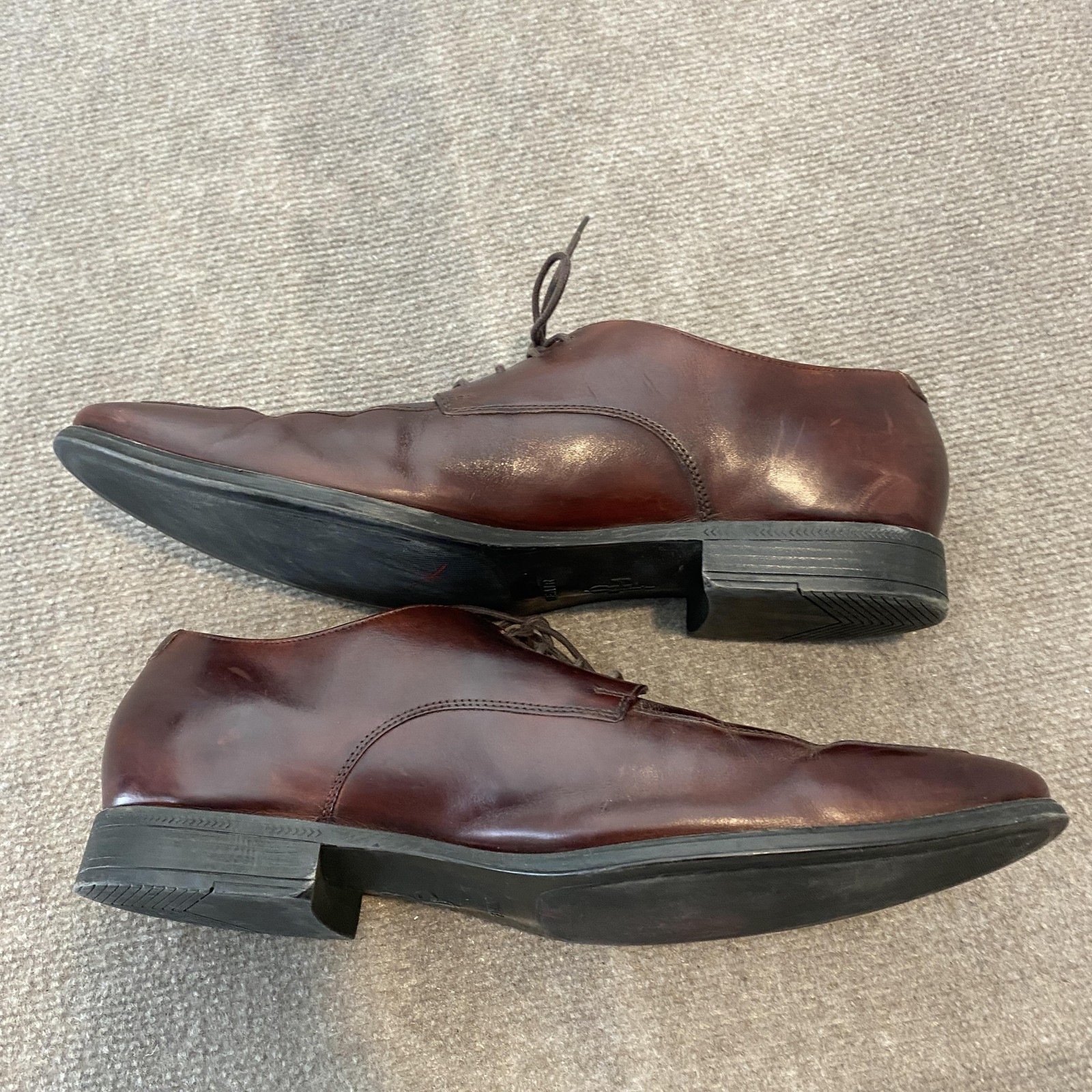 Pre-owned pair with noticeable creasing and surface scuffing on the leather uppers, particularly across the vamps, quarters, and toes. Heels show rub marks and a few small nicks, and the leather has minor color variation from normal wear. Rubber outsoles have scuffs, light soiling, and a faint reddish mark on one forefoot yet the tread and heel edges are solid; laces and eyelets are secure. Paper stuffing is present to help maintain shape and is not original packaging; original box and tags are not included. Brand: Cole Haan Style: Men's lace-up leather dress oxford shoes with squared bicycle toe and low stacked-look heel. Color: Brown upper with dark brown laces and black rubber outsole. Size: Men's US 13 M (medium width) per tongue tag. Upper material: Leather upper with cushioned leather insole, textured lining, and rubber outsole for traction and durability. Model/style code on tongue: C09436 FE12; US patent number 5713141; made in India. Details: Traditional lace-up closure, stitched bicycle toe design, sleek low-profile dress sole, and Cole Haan Nike Air comfort cushioning. Overall condition: Pre-owned shoes with creasing and scuffing to the leather uppers and light wear to the rubber outsoles; see photos for close-ups.