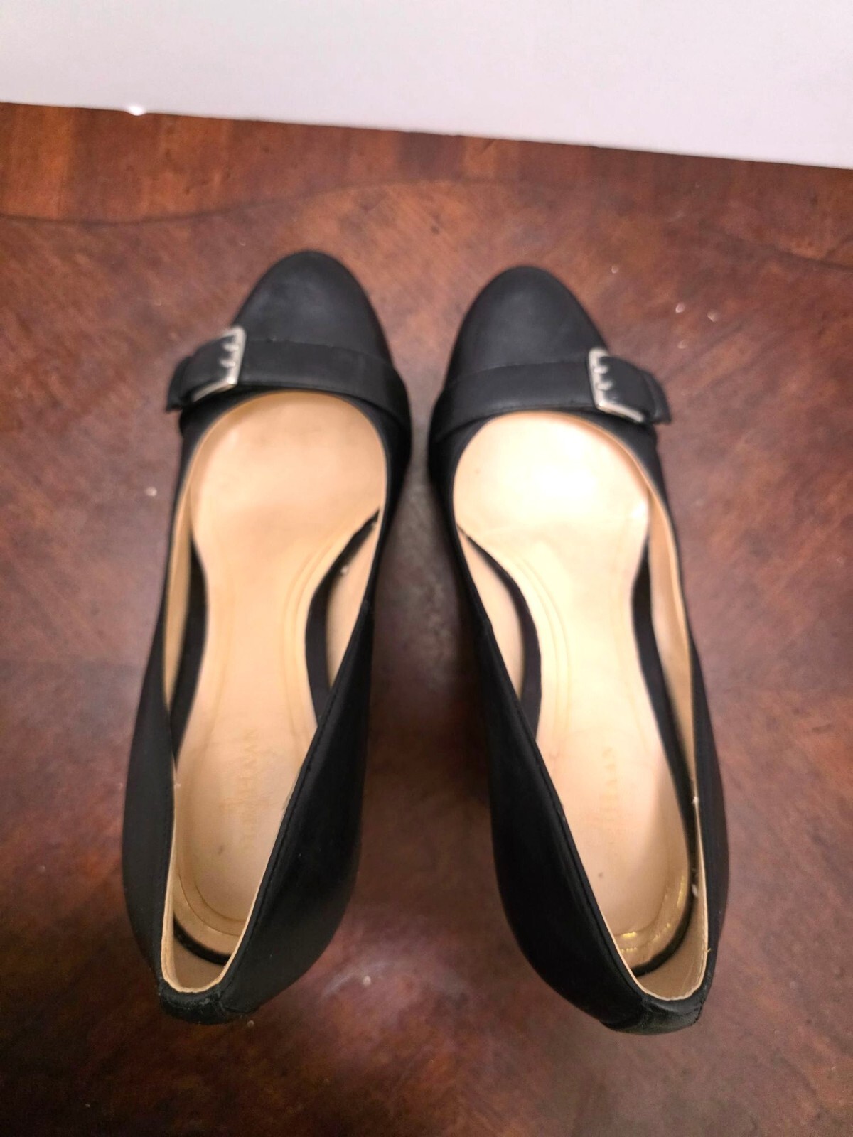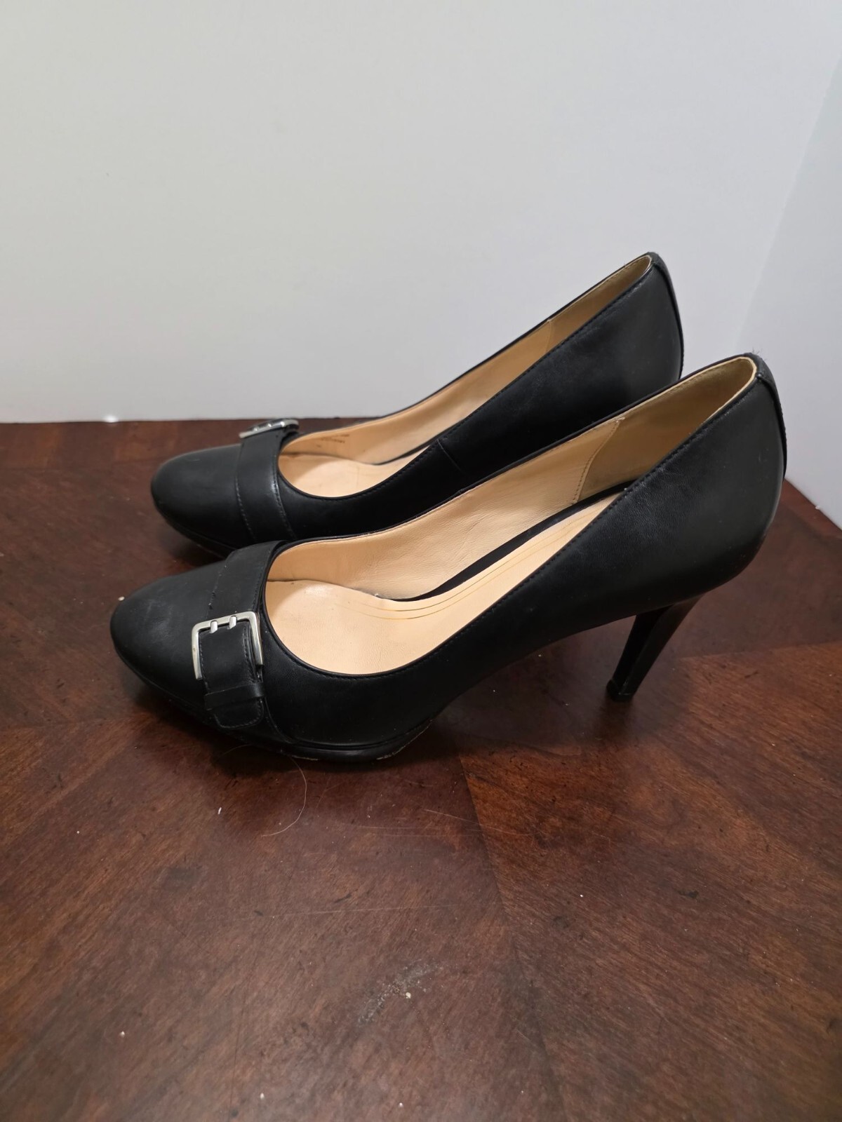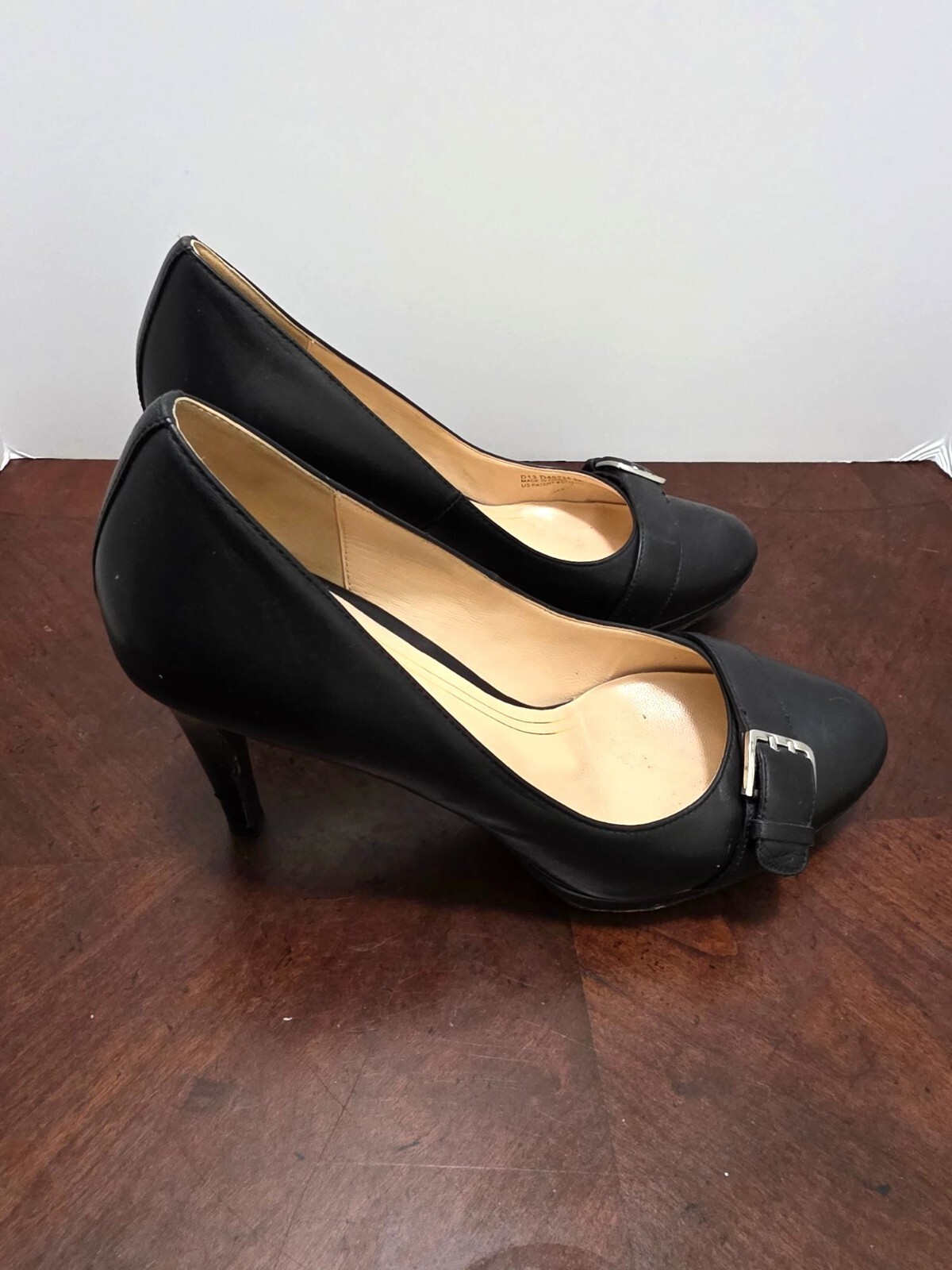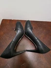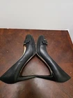 These sophisticated pumps feature a timeless silhouette with a decorative buckle accent. The leather construction and neutral black colorway offer versatility for professional or formal wear. The mid-height heel provides comfort while maintaining elegance. • Decorative silver-tone buckle detail on vamp • Round toe design • 3.5 inch heel height • Padded insole • Genuine leather upper • Non-slip rubber sole • Classic pump silhouette CONDITIONS pre owned, Minor wear on soles and light scuffing on heels, good conditions. see photos for flaws details.