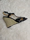 Cole Haan open toe wedge heel in size 5.5 B features a strappy design with a festive, going out, and wedding theme. The black patent leather shoe has a high heel height, cushioned and lightweight construction, adjustable ankle strap with buckle closure, and Nike Air technology. Perfect for a stylish and comfortable look.....B1016