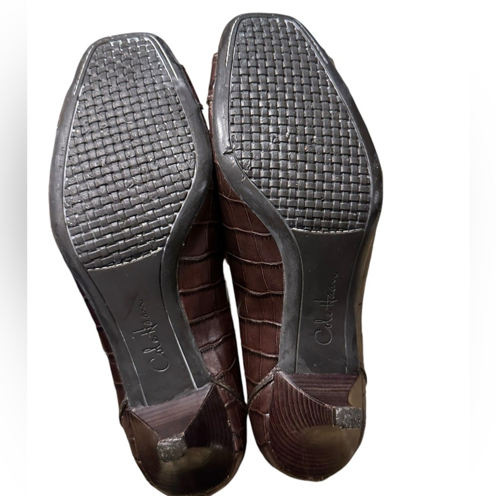 Step out in style with these beautiful Cole Haan kitten heel pumps! These shoes feature a sophisticated brown leather with a unique crocodile print. Perfect for adding a touch of elegance to any outfit. Size: 8.5 Brand: Cole Haan Style: Pumps Color: Brown Material: Leather with crocodile print Heel Height: Kitten heel Condition: Gently Used, in excellent condition These pumps are perfect for work, a night out, or any special occasion. Don't miss out on the chance to own these stylish and comfortable shoes!