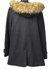 The Cole Haan Wool Twill Short Duffel Coat in Women's size 4 is a stylish and versatile outerwear piece perfect for travel, casual outings, or business meetings. Made with a luxurious wool twill fabric and features faux fur hood trim, this classic pea coat design offers both warmth and sophistication. The black color, long sleeves, and lined interior make it a timeless and elegant choice for the winter season. Garment care includes dry cleaning only to maintain its high-quality construction. Perfect for the modern woman looking for a designer piece to elevate her wardrobe.