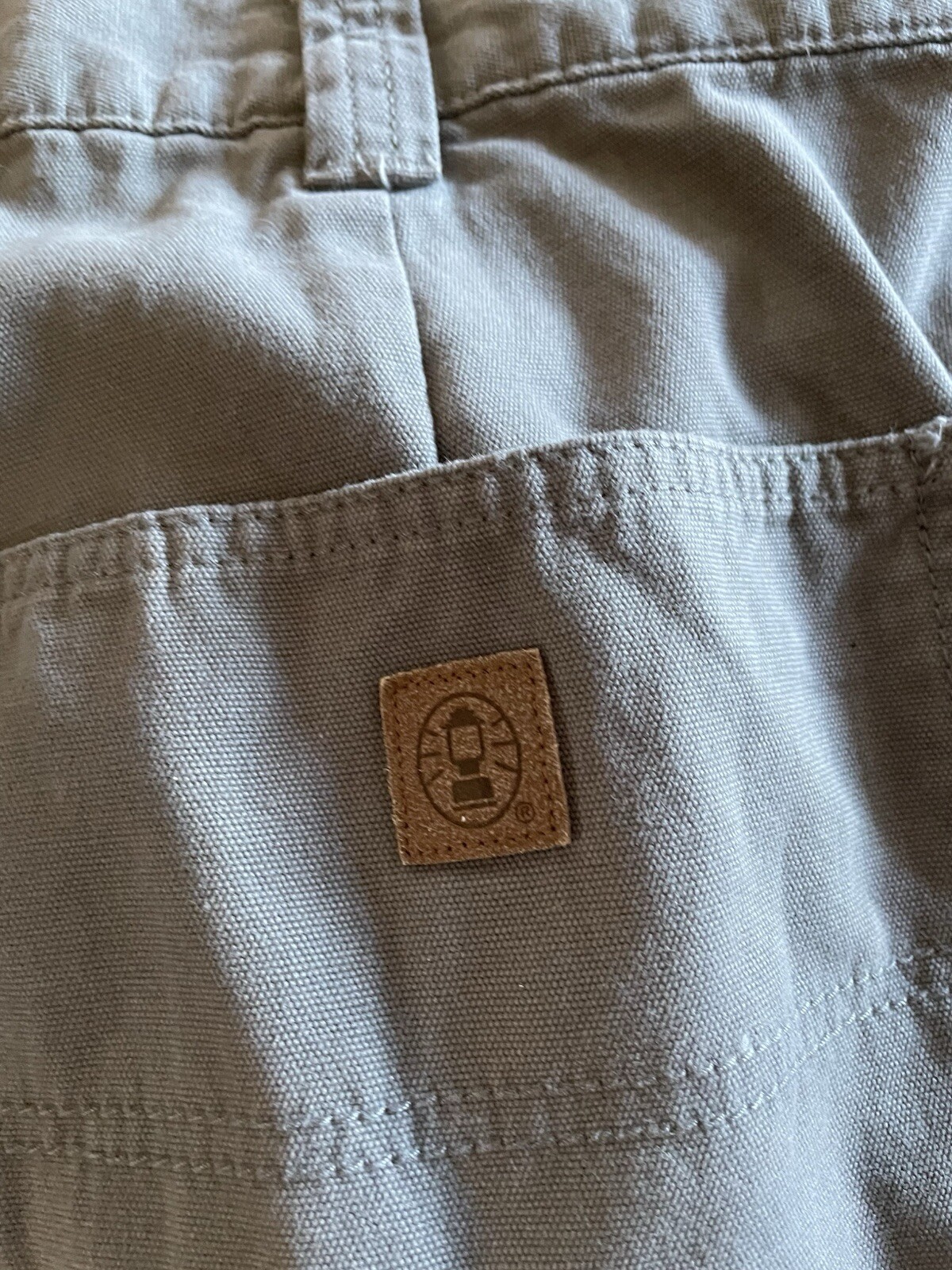 These are Coleman men's gray pants in size 40x32, made of plaid fleece material. They feature a solid pattern, lined design, and a flat front style with a straight leg. The pants have a zip and button closure, suitable for travel, casual, or workwear occasions. The brand is Coleman, and the pants are machine washable. Excellent Condition.