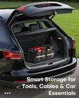 AMPLE STORAGE & COMPARTMENTS: This SUV trunk organizer offers two spacious compartments, each with an internal mesh pocket, plus four side mesh pockets and a front pocket for easy access. Perfect for groceries, tools, or car camping essentials, it keeps your items organized and your vehicle clutter-free. STURDY UPRIGHT STRUCTURE: Constructed with reinforced panels and a solid base, this trunk organizer maintains its shape even when empty. Unlike flimsy car organizers and storage boxes that collapse, it stays upright and stable, making loading and unloading quick and easy while keeping your trunk tidy. REFLECTIVE SAFETY STRIPS: A reflective strip on one side enhances visibility in low-light conditions. Whether you’re grabbing gear at night or parked roadside, this safety feature helps alert others to your presence. It’s a practical addition for road trips and car camping essentials. COLLAPSIBLE & SPACE-SAVING: Designed with a fully or half-foldable structure, this car organizer trunk adapts to your needs—use one compartment or fold it flat for compact storage. The base panels also fold, and clip buckles keep it secured, making it ideal for daily use and occasional trips. STABLE & SLIP-RESISTANT: Equipped with hook-and-loop fasteners on the bottom, this SUV trunk organizer stays firmly in place even during sudden stops or sharp turns. It prevents shifting or tipping, providing reliable storage that keeps your gear secure and your trunk neat on every drive