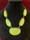 This statement necklace features a large oval pendant in a vibrant florescent lime green color, made from resin and foil. The necklace is designed as a collar style, with a length of 18 inches. It falls under the theme of Fashion & Costumes, making it a bold and eye-catching piece that can elevate any outfit. Perfect for those looking to make a stylish statement with their jewelry, this necklace is a striking addition to any accessory collection.