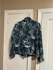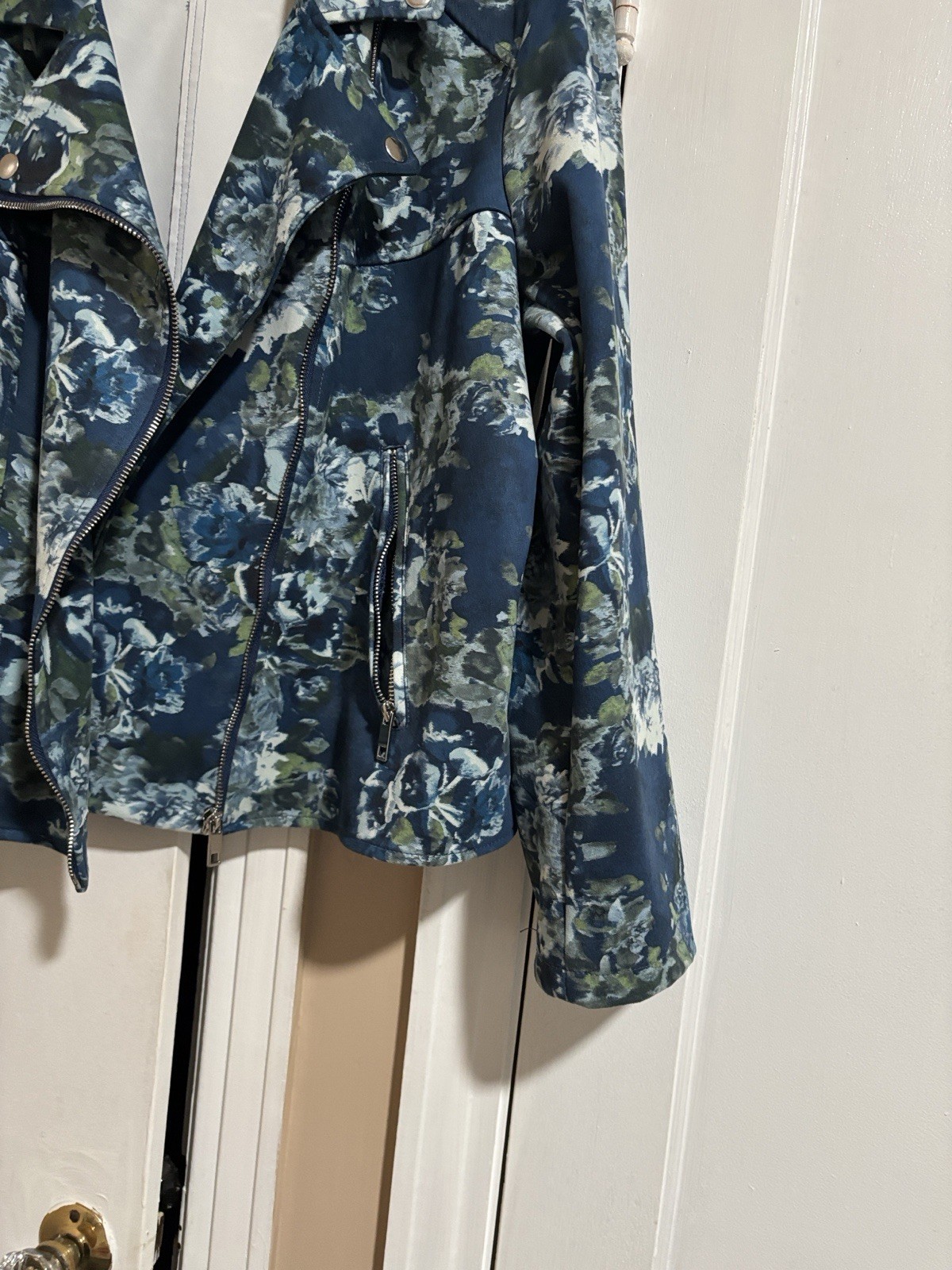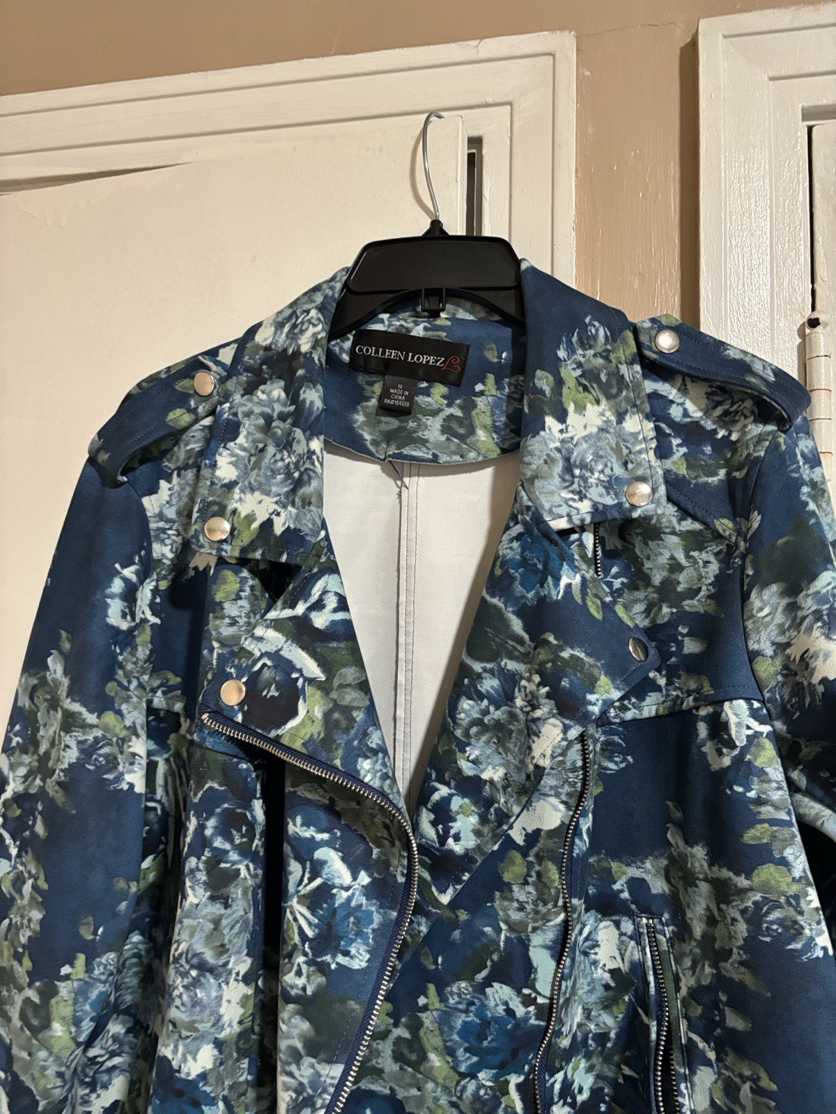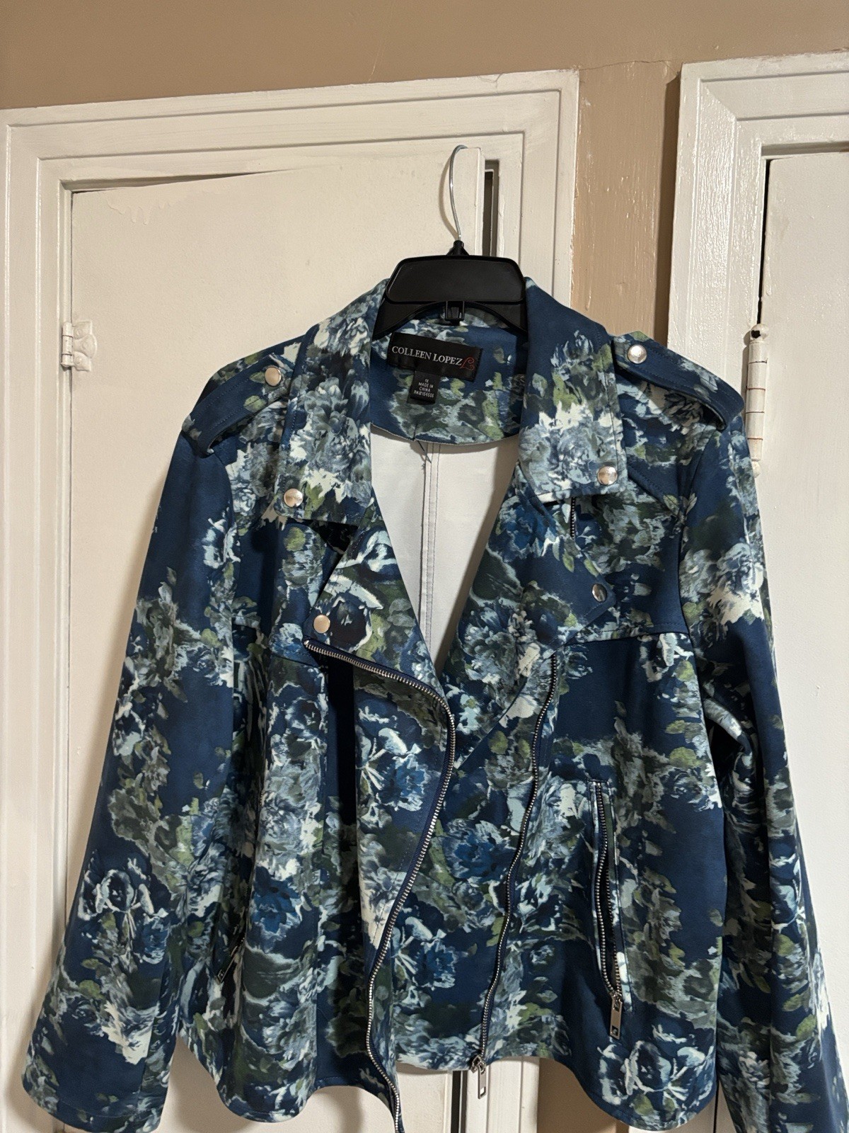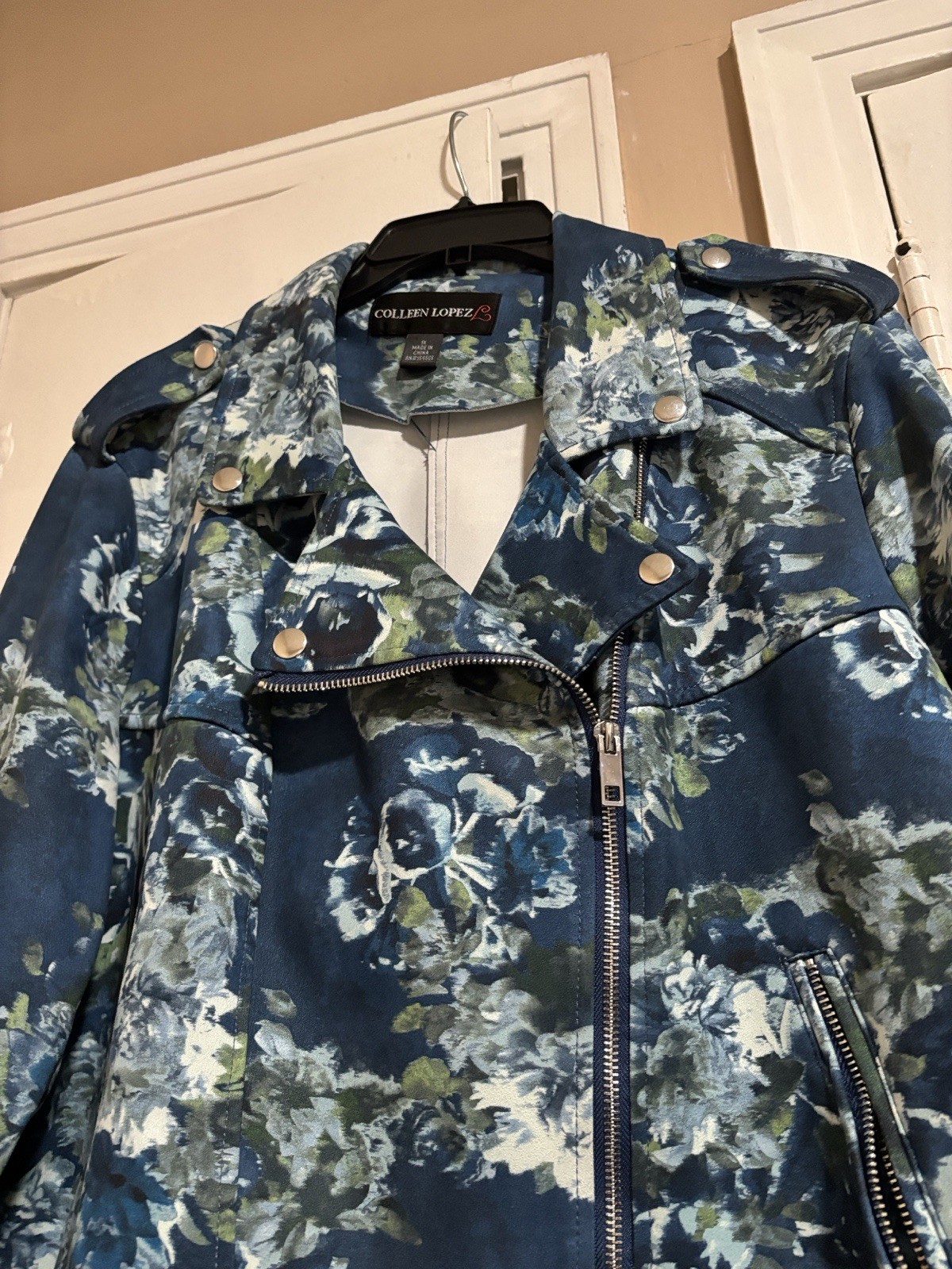 The Colleen Lopez Women's Floral Moto Jacket in Blush Teal is a stylish and versatile outerwear piece, perfect for casual occasions during the fall and spring seasons. This short-length jacket features a floral pattern in a beautiful blue color. With long sleeves and a regular fit in size XL, this basic jacket from the renowned brand Colleen Lopez is machine washable for easy care. Ideal for women looking for a fashionable and easy-to-wear jacket that adds a touch of flair to any outfit.