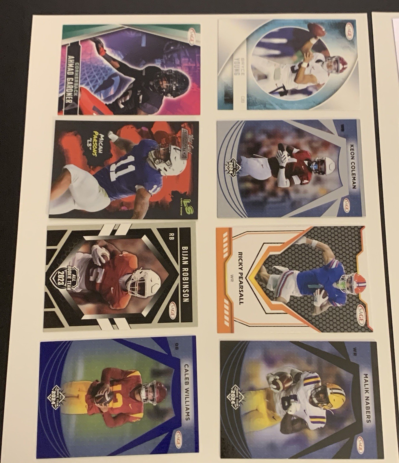 The Sage, Panini and Wild card College Football Card Lot consists of a collection of 16 of today’s NFL stars when they were in college! The 16 card Lot consist of Adrian Peterson, Matthew Stafford, Nico Collin’s, Jalen Milroe, Jordan Addison, Ladd McConkey, Bo Nix, Bryce Young, Keon Coleman, Rickey Pearsall, Malik Nabers, Sauce Gardner, Micah Parsons, Bijan Robinson and Caleb Williams! Mint!!!