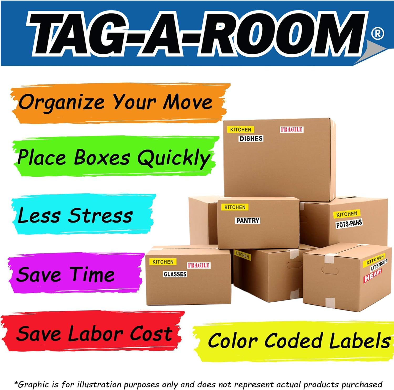 Color-Coded Organization: Quickly and easily identify where each box belongs with our vibrant color-coded moving labels. No more mix-ups—just stick and sort for a stress-free move! Save Time & Money: Avoid costly mistakes and confusion with clear, room-specific labels that simplify the unloading process, saving you valuable time and labor costs on moving day. Stay Organized & Efficient: Perfect for movers, families, and businesses, our labels are essential for a seamless and well-organized move. Keep track of every item with ease! Enhanced Box Protection: Includes "Fragile" stickers to protect your delicate items during transit. Safeguard your belongings and give yourself peace of mind. Proudly Made in the USA: Our labels are manufactured and packaged in the USA, supporting American jobs. Discover more moving accessories in our store. Product Description Over 30 Years in the Making - The Birth of an Organized Move TAG-A-ROOM is the original creator of the color coded moving and storage label systems. TAG-A-ROOM was created over 30 years ago by the owner of a small moving company in San Antonio, Texas to differentiate their company from other moving companies. They used labels to organize the boxes and furniture throughout the move process, thus reducing the chance of having mis-marked and misplaced boxes which resulted in customers’ saving of time and money. This eliminated the question: “Where does it go?” Support American Jobs We Manufacture and Package Our Packs in the USA.By choosing our packs, you're supporting American workers and their families. Our products are produced in facilities that adhere to strict quality standards and provide good-paying jobs for people in our communities. Home Moving Labels Color Coded 800 Count Tag-A-Room's 800 Count Color Coded Moving Labels and Fragile Stickers Pack is the perfect solution for anyone who wants to stay organized during their move. This pack includes 50 labels each for Master Bedroom, Bedroom 2, Bedroom 3, Bedroom 4, Master Bath, Bathroom 2, Bathroom 3, Kitchen, Dining Room, Family Room, Living Room, Study, Utility Room, and Storage, as well as 100 Fragile Labels, ensuring that all your belongings are properly labeled and protected during transit. Stay Organized Stay on top of your move with ease using our versatile and customizable moving labels. Perfect for labeling boxes and other belongings, our packing labels are an essential tool for anyone who wants to stay organized during a move. Simplify Your Move Our high-quality, color-coded moving labels make it easy to identify the contents of each box and where it belongs. Say goodbye to the chaos of moving and save time and stress with our must-have packing labels. Reduce Moving Cost Avoid mistakes and confusion during your move with our top-rated moving box stickers. Our labels are designed to simplify the unloading process, saving you time and money. Keep your move organized and hassle-free with our cost-effective packing labels. Protect Your Belongings Our high-quality packing labels help protect your valuable belongings during your move. Our labels ensure that fragile items are marked and handled with care, reducing the risk of damage and giving you peace of mind. Our packing labels are the ideal solution for anyone who wants to ensure their items arrive safely at their destination. Thank You for Choosing Tag-A-Room for Your Organization Needs