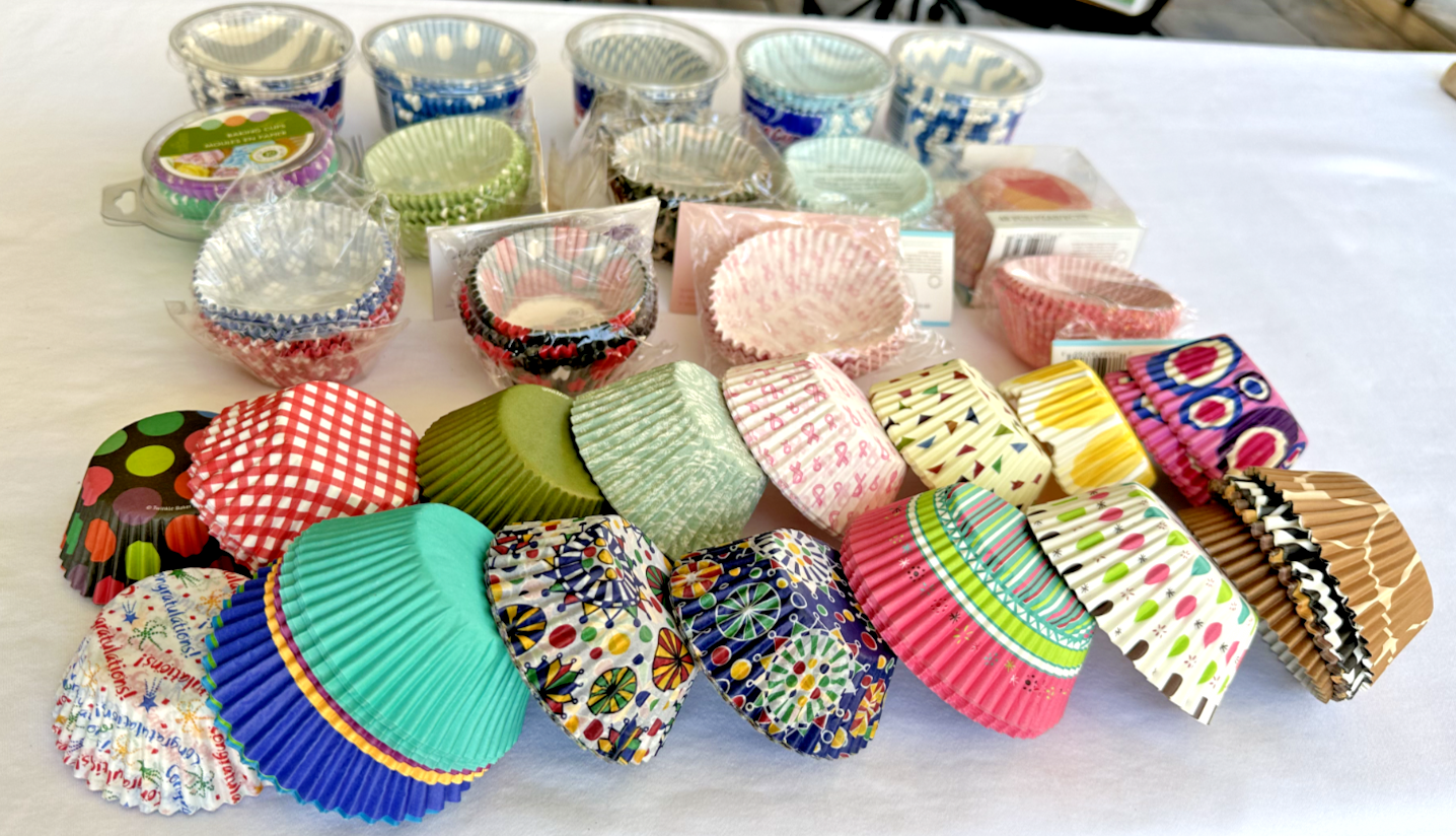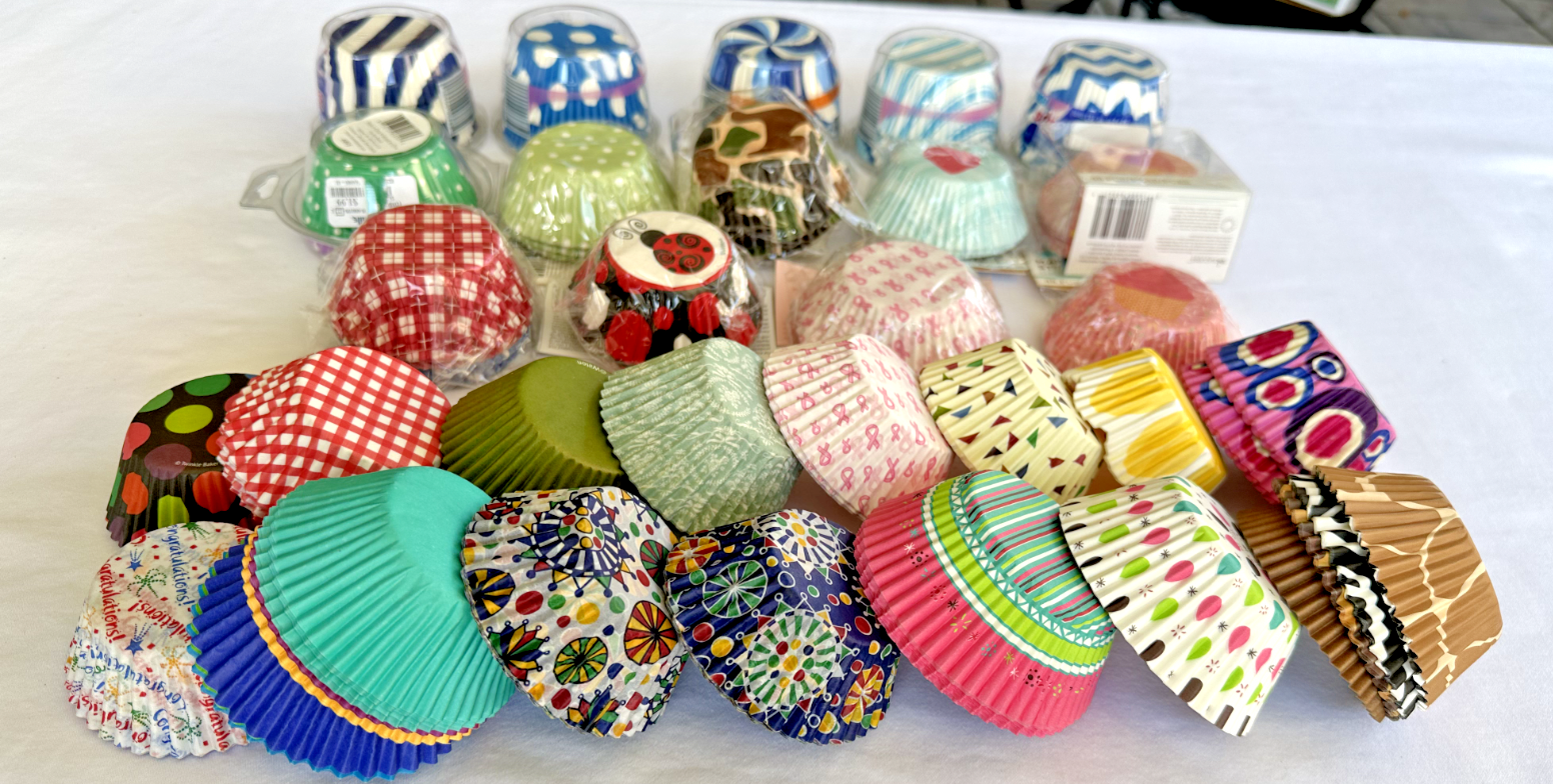 This assorted lot of cupcake paper liners cups features various motifs and is almost all unopened. The standard-sized cups are oven-safe and made of paper, with a diameter of 3 inches. The multicolor liners are perfect for all occasions and come from well-known brands like Martha Stewart, Wilton, and Reynolds. With a mix of patterns and themes, this collection offers a variety of options for decorating your cupcakes.