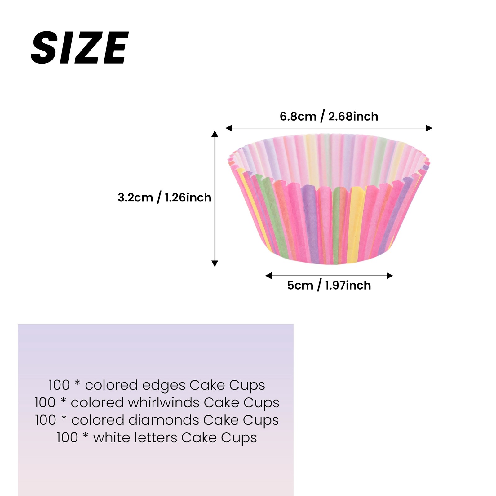 Cupcake Baking Cups Muffin Cupcake Liners Combo Disposable Baking Cups4112 HEALTHY MATERIAL & NO COLOR FADING:Grease-proof, grade paper cupcake cups,suitable for oven, Miniwave, steam cooking,our cups are specially designed to keep colors from fading after baking, to keep colors bright and fun for every moment. FUN DESIGN:Brightly colored fluted paper cups liners with a fun design,have a nice day start from the morning and your dessert! EMBELLISH YOU LIFE: Our cupcake liner is great holding candies, nuts and other party snacks, colorful and festive way to dress up your cupcakes and muffins,perfect for your theme party, for baking mini treats. Please note! ! Because it is a mechanism paper tray, the quantity error is +/- 5 Cautions: no direct exposure to fire and not suitable for cooking; no water or oils are allowed in the cup mould; the highest baking temperature should be not more than 250 degrees Celsius and the baking time should not be too long to avoid damage to the cups and food. Size: 3.2cm high, 5cm bottom diameter, 6.8cm mouth diameter Material:Oil proof paper Colour:color Package Contents: 100 * colored edges Cake Cups 100 * colored whirlwinds Cake Cups 100 * colored diamonds Cake Cups 100 * white letters Cake Cups