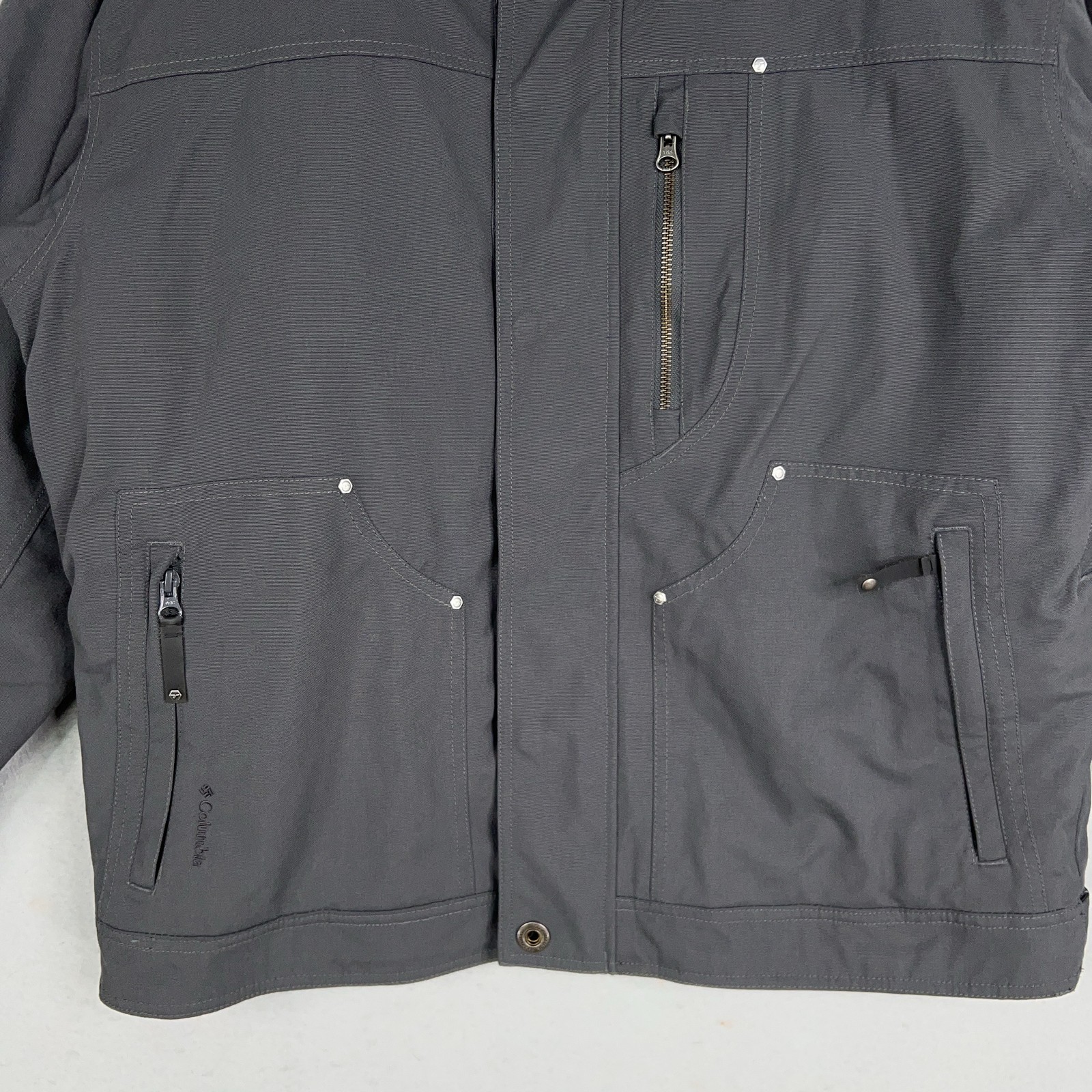 Columbia Jacket Mens Large Gray Titanium OmniTech Coat Performance Hike Ski Gorp Condition: Good pre-owned condition. Light general wear from normal use, no major stains or rips noted. All zippers and snaps functional. Omni-Tech high performance waterproof/breathable shell Features hood with drawcord, zip and snap front closure, three zippered front pockets Soft plush fleece interior lining for warmth and comfort Size: Large (Mens) - See photos for actual measurements Excellent for cold, wet winter outdoor activities, hiking, or everyday winter wear Measurements: - Previous washings may change the sizing written on the tag. - Please refer to the photos above for all measurements. - Please compare our measurements to that of one of your favorite garments. - Please note, item measurements are approximate . All items are bagged and sealed after being photographed, then stored in a smoke free environment to ensure the item is exactly the same as when photographed. All items have been washed per eBay standards & policies. I carefully package and ship daily. Feel free to contact me with any questions.