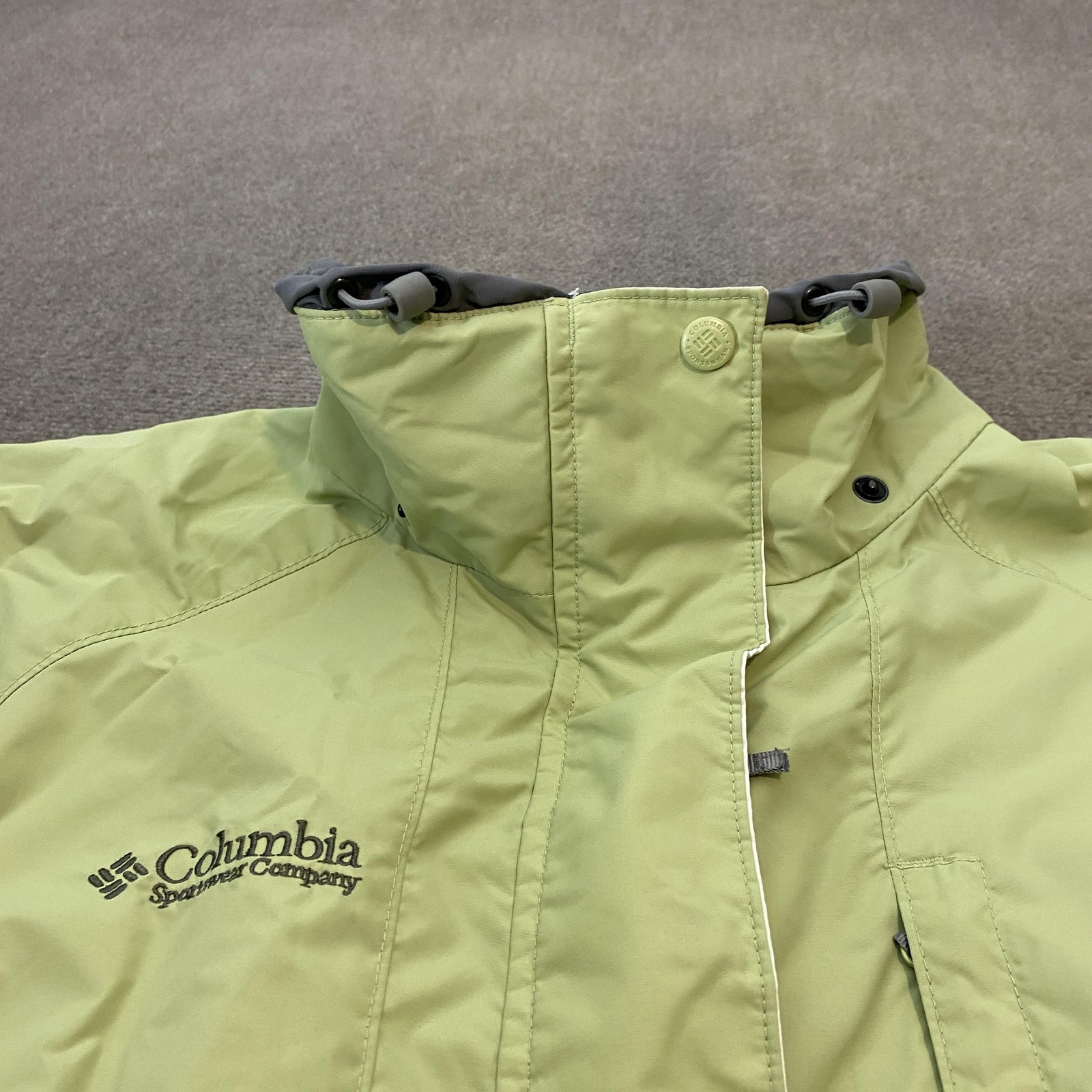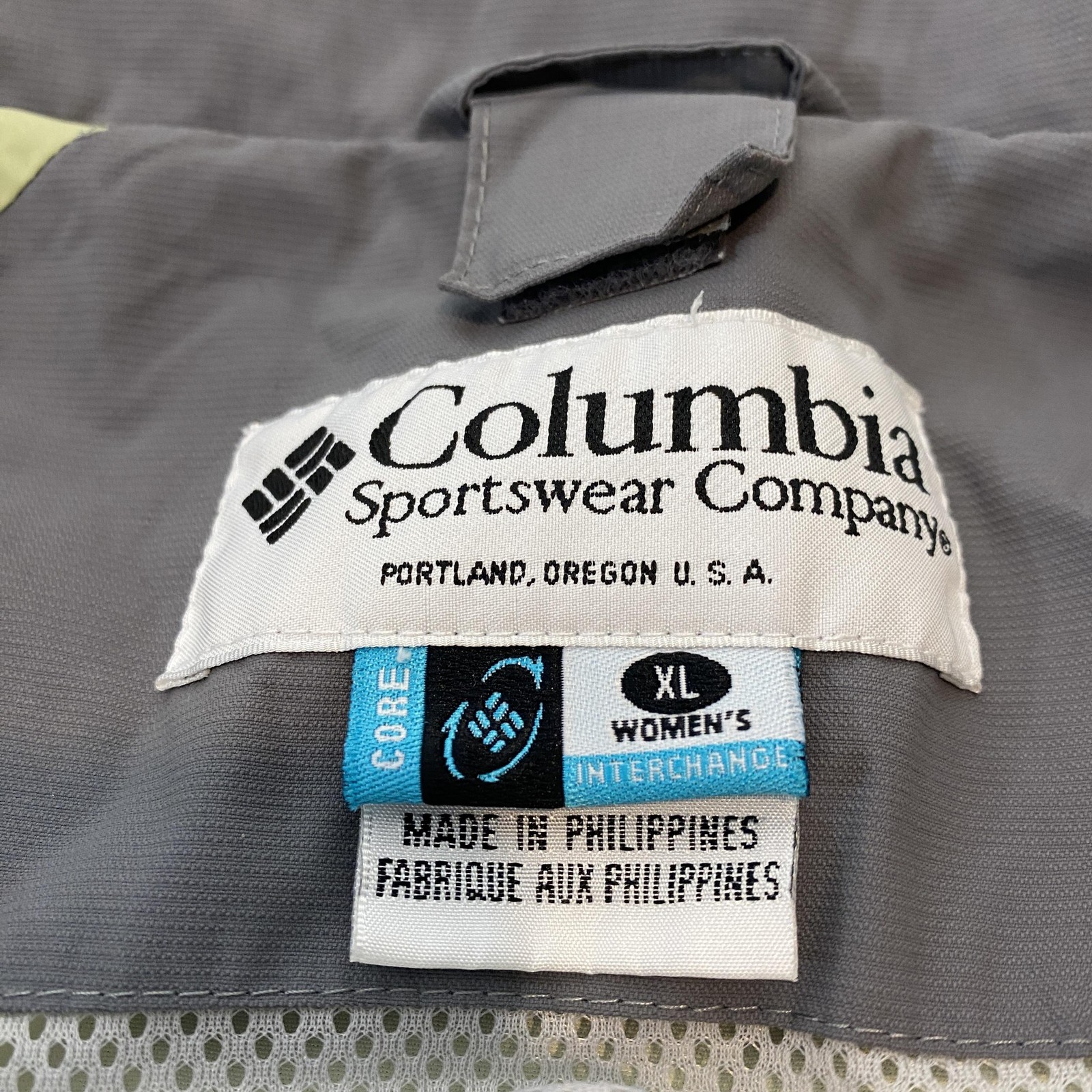 Gently worn with light overall wear and wrinkling from storage. Small faint mark on outer fabric as shown in photos. Zippers and snaps function properly with no major damage or tears noted. Brand: Columbia Sportswear Company Style: Women's Core Interchange outdoor jacket shell in light green with gray and white accents. What it is: Hooded jacket/coat with full front zipper and snap storm flap designed for outdoor wear. Size on tag: Womens XL. Materials (per tag): Shell and lining colors 100% nylon/polyamide; white sections 100% polyester; upper front lining, body and pocket bag lining 100% polyester. Country of manufacture: Made in Philippines. Style/Model information on tag: F3 XL7782; RN 69724; CA 05367. Details: Mesh upper lining, stand collar with stowaway hood drawcords, elastic and hook-and-loop cuff closures, zip hand pockets, inner attachment points for an interchange liner, reflective white sleeve panels, and adjustable drawcord hem. No written measurements are provided; please compare the tagged size to a similar jacket for best fit.