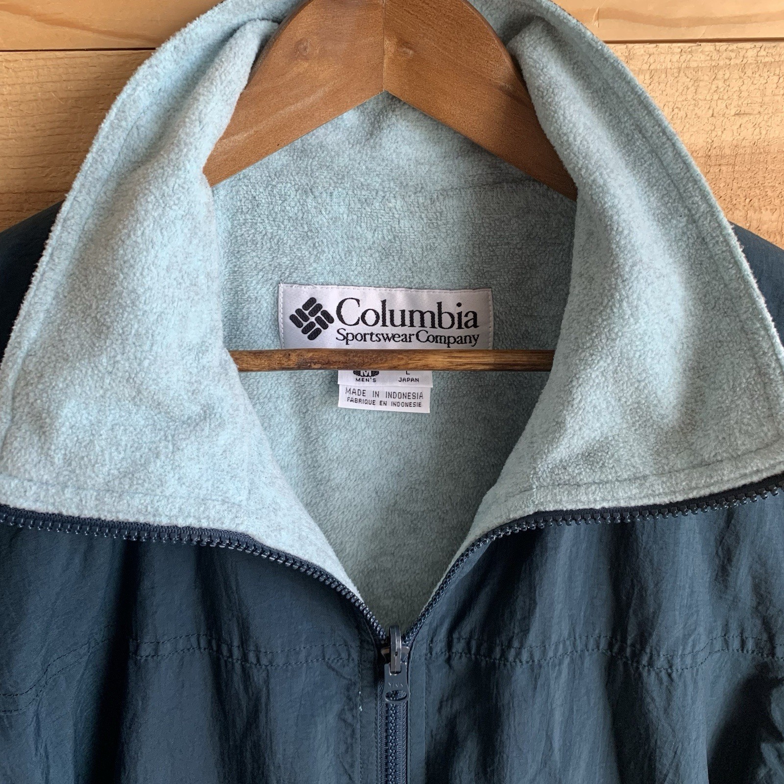 Columbia Men’s Jacket Blue Teal Lined Windbreaker Medium The material tag is worn so I’m not sure what it is but it feels like nylon on the outside and a softer felt type material lining. The color is a deep blue/green/teal with lighter teal inner color. It’s in great condition. Men’s size M measuring 20” shoulder to shoulder, 22” pit to pit, 21” sleeves and 26.5” shoulder to bottom hem.